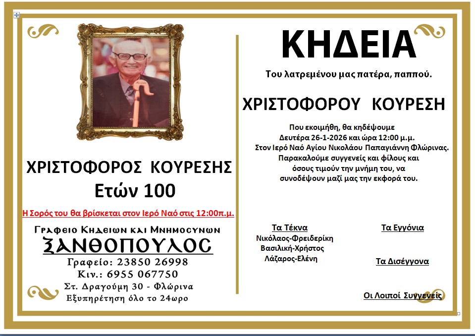 ΚοινωνικάΚηδεία του Χριστόφορου Κουρέση, ετών 100 Κυριακή 25 Ιανουαρίου, 2026 11:47 florinapress.gr SHARE Ίσως να ενδιαφέρει ... Κηδεία της Adelina Gllafce ετών 51 Ψήφισμα του Δ. Σ. του Συλλόγου Εκπαιδευτικών Πρωτοβάθμιας Εκπαίδευσης Φλώρινας Κηδεία της Μαριάνθης Σταματιάδου, ετών 94 Κηδεία του Τηλέμαχου Κίτσα, ετών 90 Κηδεία του Ηλία Άλτα Share Ακολουθήστε μας8.4kFollowersLikeΤελευταία νέα Κηδεία της Ανθούλας Θεωδουλίδου, ετών 79 Κοινωνικά Κυριακή 25 Ιανουαρίου, 2026 Κοπή βασιλόπιτας του Συνδέσμου Εφέδρων Αξιωματικών Φλώρινας Πολιτισμός Σάββατο 24 Ιανουαρίου, 2026 Πέτη Πέρκα: Ζούμε σε έναν κόσμο που καταρρέει και η λύση είναι Αριστερά Πολιτική Σάββατο 24 Ιανουαρίου, 2026 Ο Σίμος Κωνσταντίνου των Λυγκηστών στο San Diego της Καλιφόρνιας, διδάσκοντας και μεταδίδοντας τον πολιτισμό και τη μουσικοχορευτική παράδοση της Φλώρινας Πολιτισμός Σάββατο 24 Ιανουαρίου, 2026