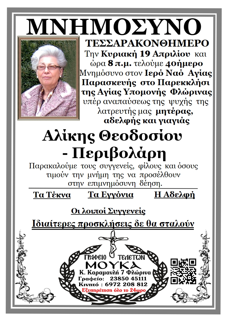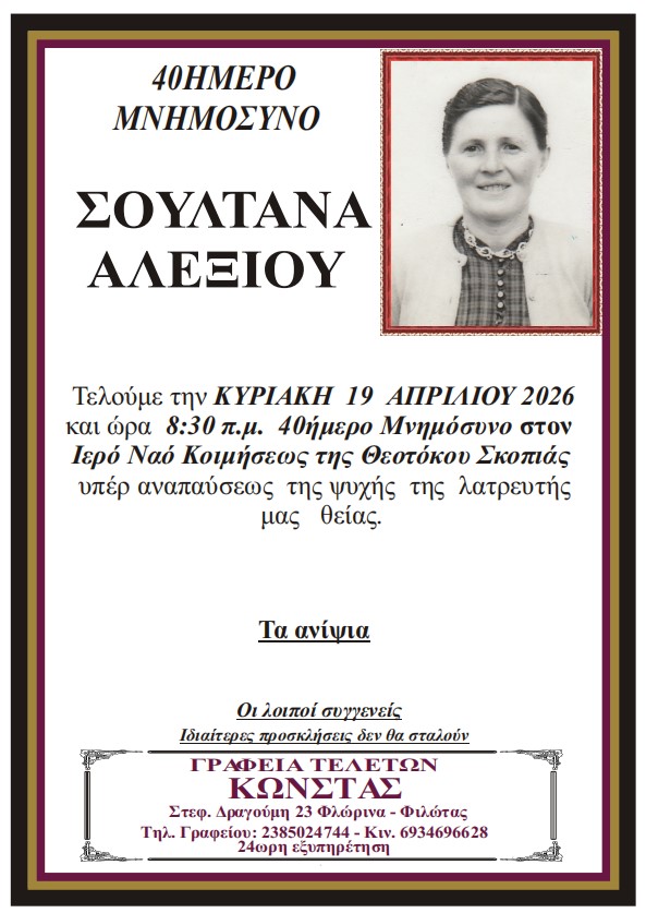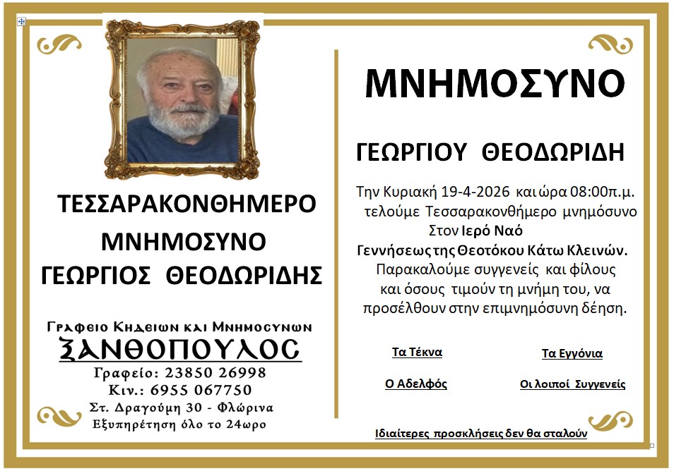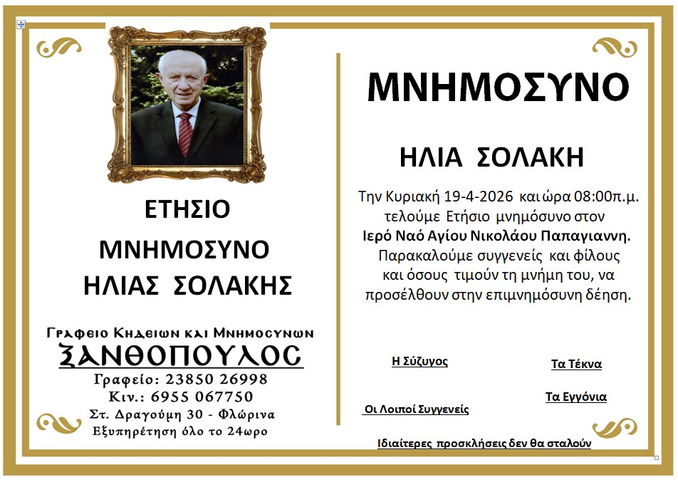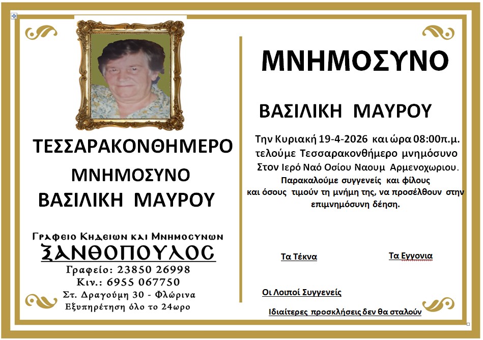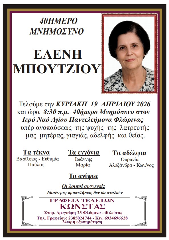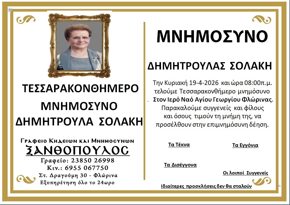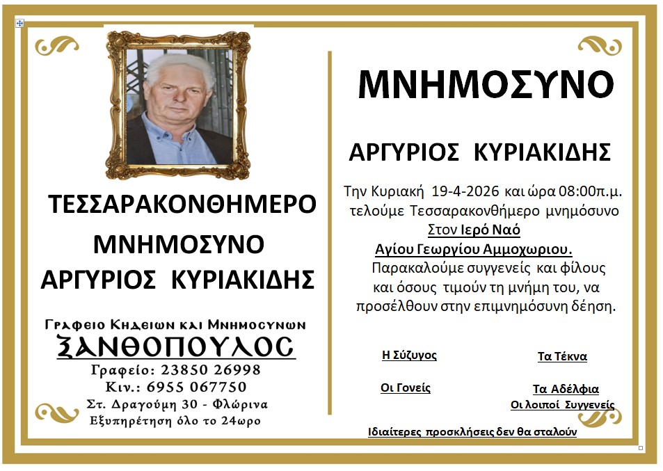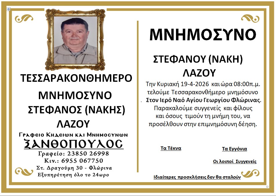 ΚοινωνικάΜνημόσυνα Κυριακής 19 Απριλίου 2026 Πέμπτη 16 Απριλίου, 2026 22:52 florinapress.gr SHARE Ίσως να ενδιαφέρει ... Κηδεία του Παύλου Νταϊρετζή, ετών 84 Κηδεία του Ηλία Αναστασίου, ετών 59 Προσεγγίσεις: Μεγάλο Σάββατο – Η σιωπή πριν το φως Κηδεία της Σεραφούλας Κώνστα, ετών 66 Δεύτερη φάση ενίσχυσης του πρασίνου στο Αμύνταιο. 240 νέα δέντρα μέσω του Πράσινου Ταμείου Share Ακολουθήστε μας8.4kFollowersLikeΤελευταία νέα Εκδήλωση με θέμα «Σχέδιο Ανάπτυξης για τη Φλώρινα: Επιχειρήσεις, Επενδύσεις, Εργασία» Εκδηλώσεις Πολιτική Πέμπτη 16 Απριλίου, 2026 Επίσκεψη της Προέδρου της ΔΕΕΠ Φλώρινας στον Δήμαρχο Αμυνταίου Πολιτική Πέμπτη 16 Απριλίου, 2026 ΔΕΗ: Αλήθειες – υπερβολές – συγκρίσεις Επιστολές Περιβάλλον Πέμπτη 16 Απριλίου, 2026 Ευχαριστήριο μήνυμα του Δήμου Αμυνταίου για τη στήριξη στο Κοινωνικό Παντοπωλείο Κοινωνία Πέμπτη 16 Απριλίου, 2026