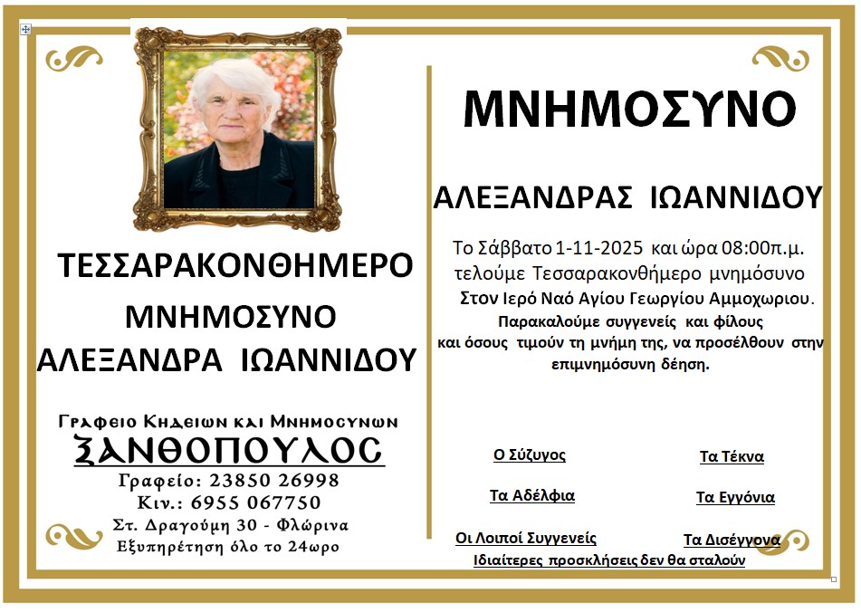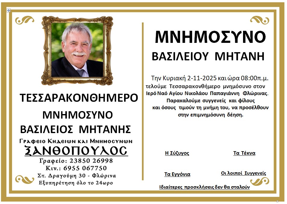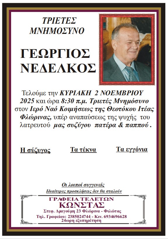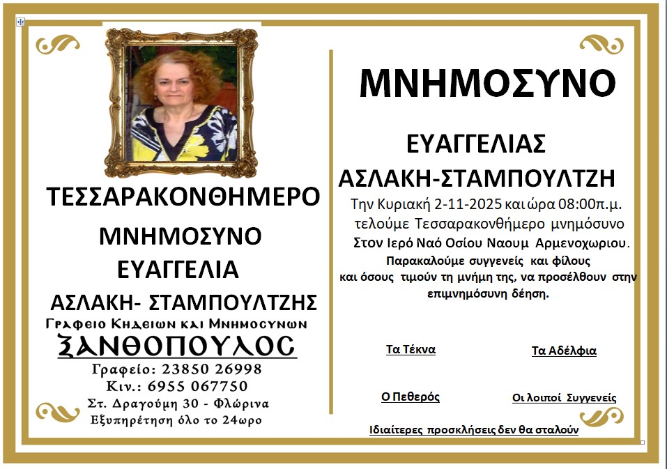 ΚοινωνικάΜνημόσυνα Σαββάτου 1 και Κυριακής 2 Νοεμβρίου Παρασκευή 31 Οκτωβρίου, 2025 22:18 florinapress.gr SHARE Ίσως να ενδιαφέρει ... Εκδήλωση μνήμης για τους πεσόντες απόστρατους Σωμάτων Ασφαλείας Διακρίσεις των αθλητών της Πρακτικής Σκοποβολής του ΑΘΛΟΣ Φλώρινα: Η μεγαλειώδης συγκέντρωση για τα Τέμπη (28/2/2025) Οι υποψήφιοι/ες σύμβουλοι της δημοτικής κοινότητας Φλώρινας του συνδυασμού “Αναπτυξιακή Πορεία” Ενοικιάζεται επιπλωμένη γκαρσονιέρα στη Φλώρινα Share Ακολουθήστε μας8.4kFollowersLikeΤελευταία νέα Αγανακτισμένοι αγρότες : Ως εδώ, η κατάσταση δεν πάει άλλο Κοινωνία Πέμπτη 4 Δεκεμβρίου, 2025 Επισκέψεις Κινητών Μονάδων Υγείας σε απομακρυσμένες Κοινότητες του Δήμου Αμυνταίου Κοινωνία Πέμπτη 4 Δεκεμβρίου, 2025 Ευχαριστήρια επιστολή του Πειραματικού Σχολείου Φλώρινας προς το Κέντρο Περιβαλλοντικής Εκπαίδευσης & Αειφορίας Μελίτης Κοινωνία Πέμπτη 4 Δεκεμβρίου, 2025 Πωλείται Γερμανικός λέβητας ξύλου Κοινωνία Πέμπτη 4 Δεκεμβρίου, 2025