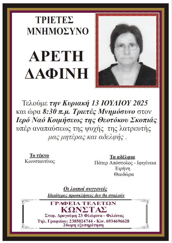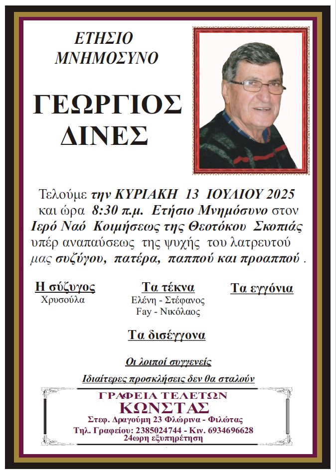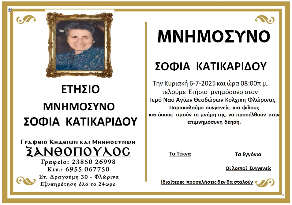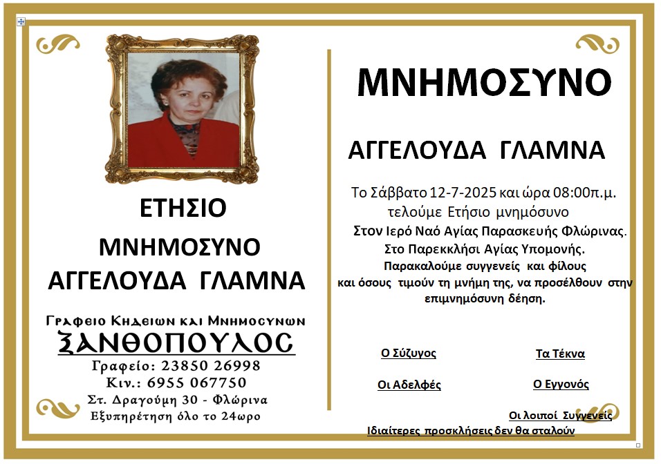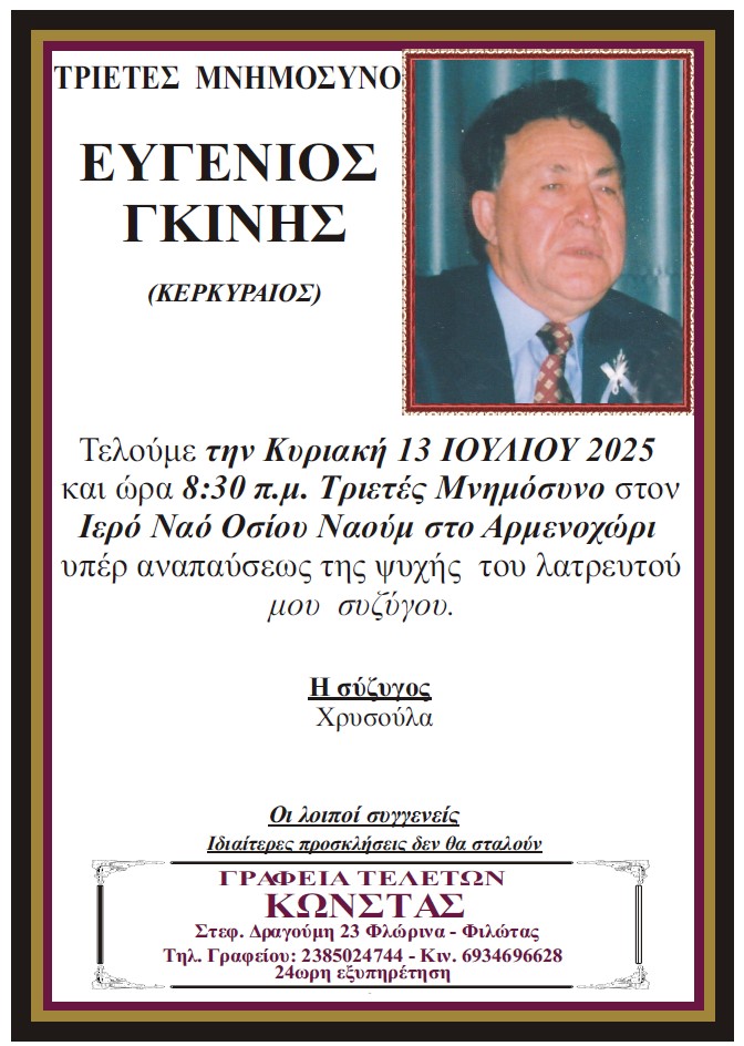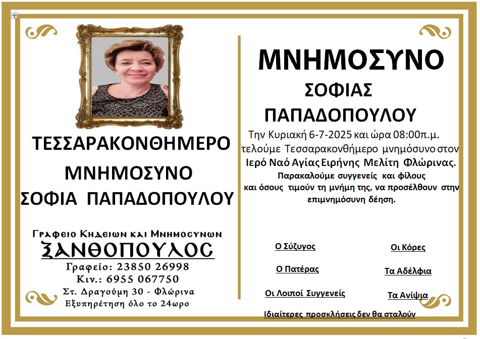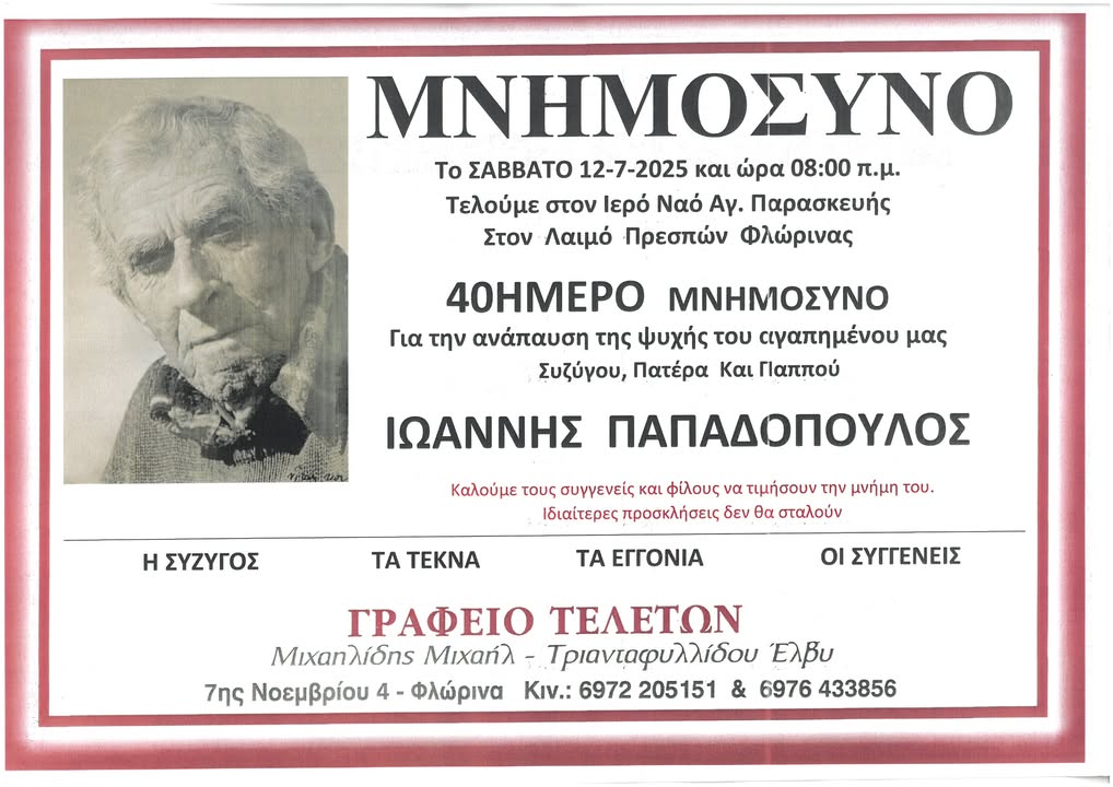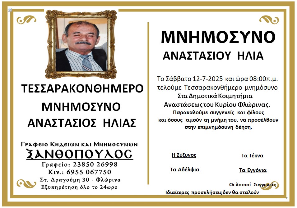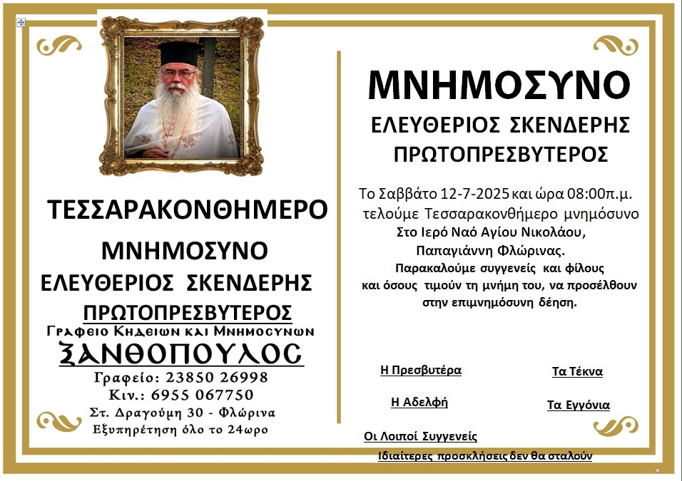 ΚοινωνικάΜνημόσυνα Σαββάτου 12 και Κυριακής 13 Ιουλίου Παρασκευή 11 Ιουλίου, 2025 21:36 florinapress.gr SHARE Ίσως να ενδιαφέρει ... Ο.ΞΙ.Φ.: «Ασημένιος ο Άγγελος στο Πανελλήνιο Εφήβων» 51ο φεστιβάλ ΚΝΕ – οδηγητή Φλώρινα Κηδεία της Φανής Μανάνη, ετών 94 Ολοκληρώθηκε η 16η Αγωνιστική της Α’ Κατηγορίας ΕΠΣ Φλώρινας Διαγωνισμός:”Τοπολατρεία” Φωτογραφίζοντας τον αγαπημένο σας τόπο Share Ακολουθήστε μας8.4kFollowersLikeΤελευταία νέα Αγανακτισμένοι αγρότες : Ως εδώ, η κατάσταση δεν πάει άλλο Κοινωνία Πέμπτη 4 Δεκεμβρίου, 2025 Επισκέψεις Κινητών Μονάδων Υγείας σε απομακρυσμένες Κοινότητες του Δήμου Αμυνταίου Κοινωνία Πέμπτη 4 Δεκεμβρίου, 2025 Ευχαριστήρια επιστολή του Πειραματικού Σχολείου Φλώρινας προς το Κέντρο Περιβαλλοντικής Εκπαίδευσης & Αειφορίας Μελίτης Κοινωνία Πέμπτη 4 Δεκεμβρίου, 2025 Πωλείται Γερμανικός λέβητας ξύλου Κοινωνία Πέμπτη 4 Δεκεμβρίου, 2025