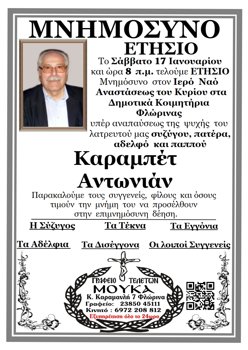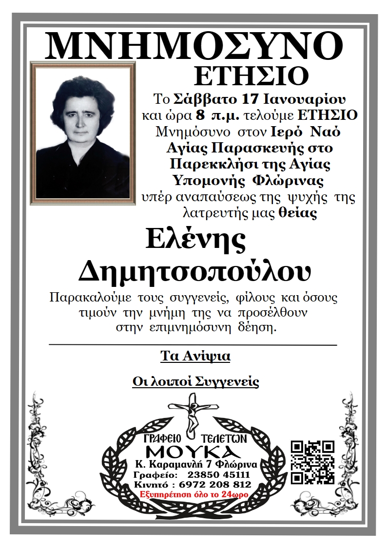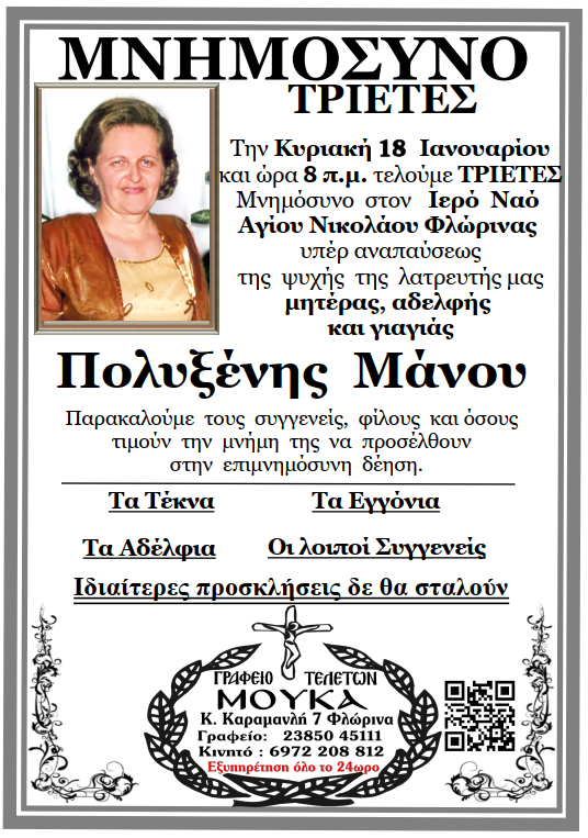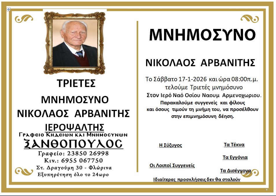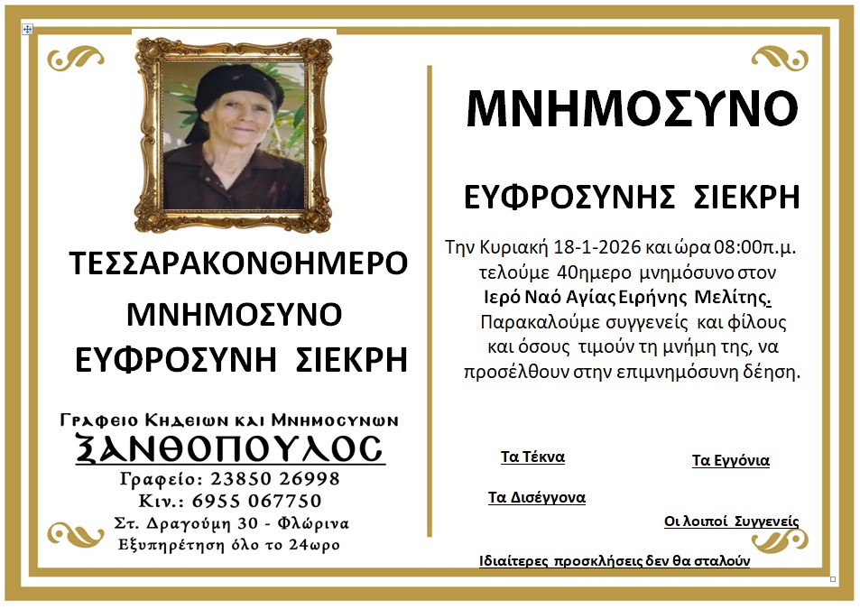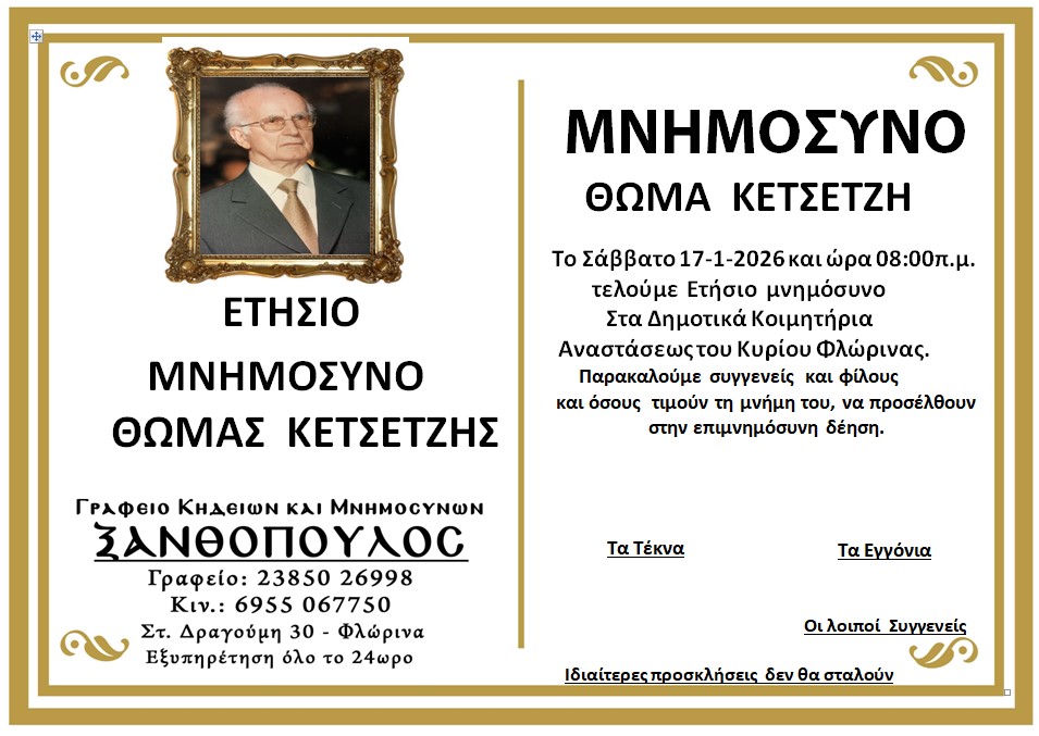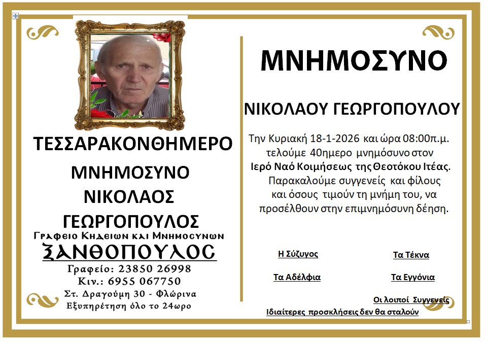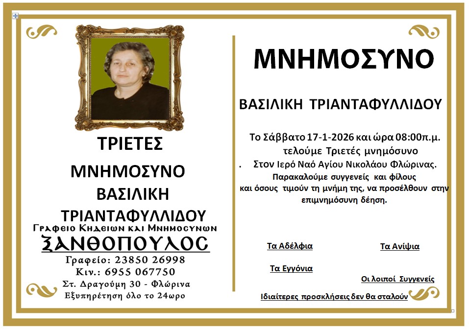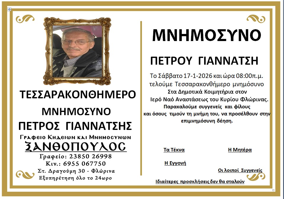 ΚοινωνικάΜνημόσυνα Σαββάτου 17 και Κυριακής 18 Ιανουαρίου Παρασκευή 16 Ιανουαρίου, 2026 22:38 florinapress.gr SHARE Ίσως να ενδιαφέρει ... Ο Σύλλογος Συνταξιούχων Δασκάλων και Νηπιαγωγών θα παρακολουθήσει την παράκληση στην Παναγία στην Ιερά Μονή Κλαδοράχης Μνημόσυνο του Γεώργιου Δέρλη Ευχαριστήριο του Συνδέσμου Μοναστηριωτών και των Πέριξ εν Φλωρίνη «Η ΕΛΠΙΣ» Πρόγραμμα εορτασμού εθνικής επετείου 25ης Μαρτίου 1821 στην Πρέσπα Κηδεία της Βασιλικής Καραμήτσου Share Ακολουθήστε μας8.4kFollowersLikeΤελευταία νέα Περιφερειακή Ενότητα Φλώρινας: Σε δύσκολες στιγμές, η άμεση παρέμβαση κάνει τη διαφορά Κοινωνία Πολιτική Παρασκευή 16 Ιανουαρίου, 2026 Συγχαρητήριο μήνυμα του Δημάρχου Φλώρινας προς τον Διοικητή Πυροσβεστικών Υπηρεσιών Νομού Φλώρινας Κοινωνία Πολιτική Παρασκευή 16 Ιανουαρίου, 2026 Συγχαρητήριο μήνυμα του Βουλευτή Στ. Παπασωτηρίου για την προαγωγή του Διοικητή της Πυροσβεστικής Υπηρεσίας Φλώρινας, Ιωάννη Μιαούλη Πολιτική Παρασκευή 16 Ιανουαρίου, 2026 Νέο πρόγραμμα εκμάθησης της επιτραπέζιας αντισφαίρισης Αθλητισμός Παρασκευή 16 Ιανουαρίου, 2026
