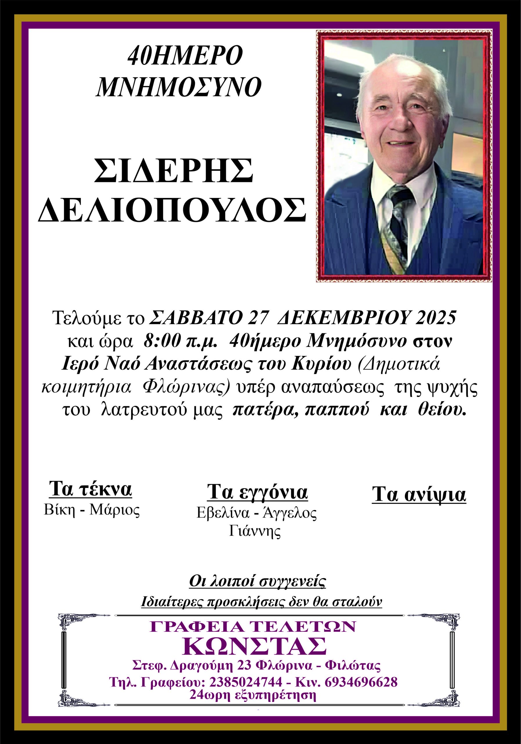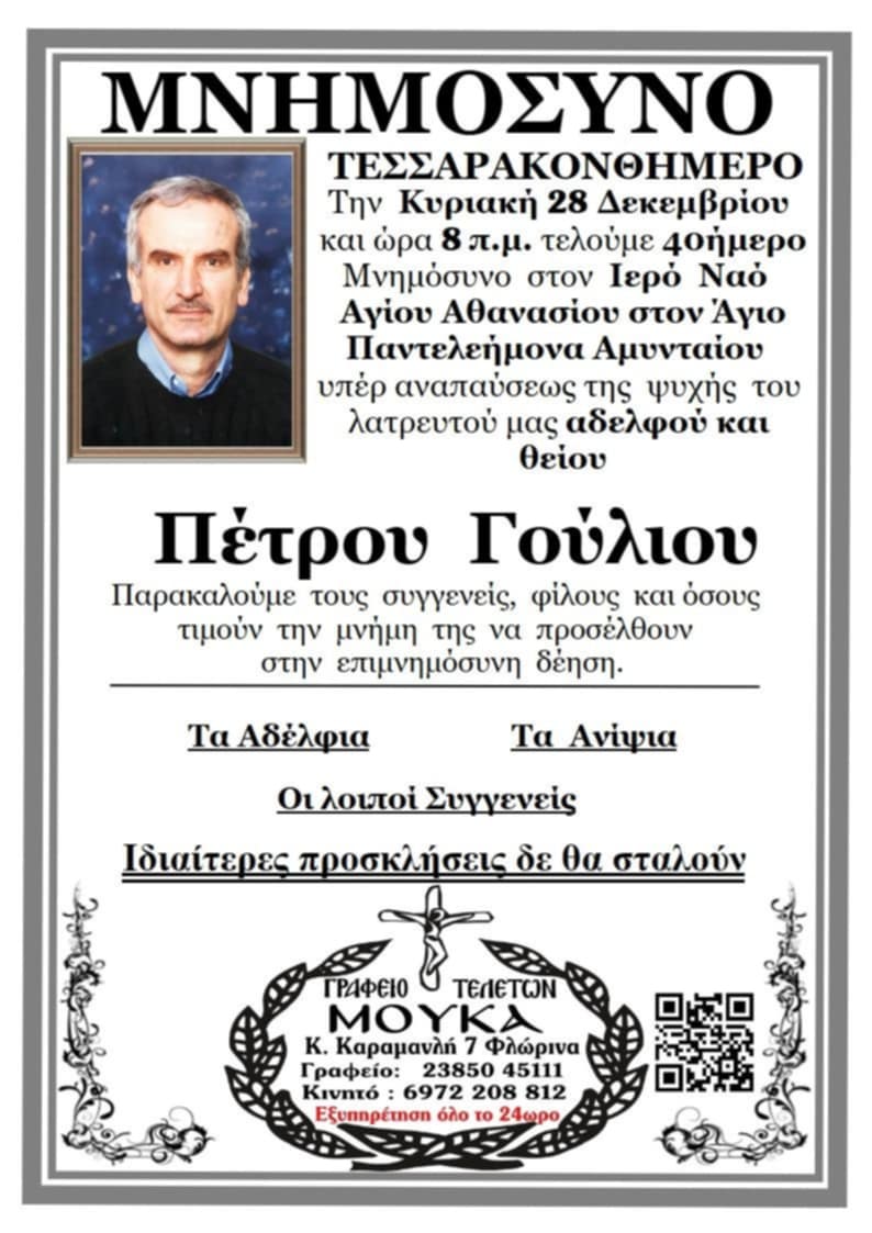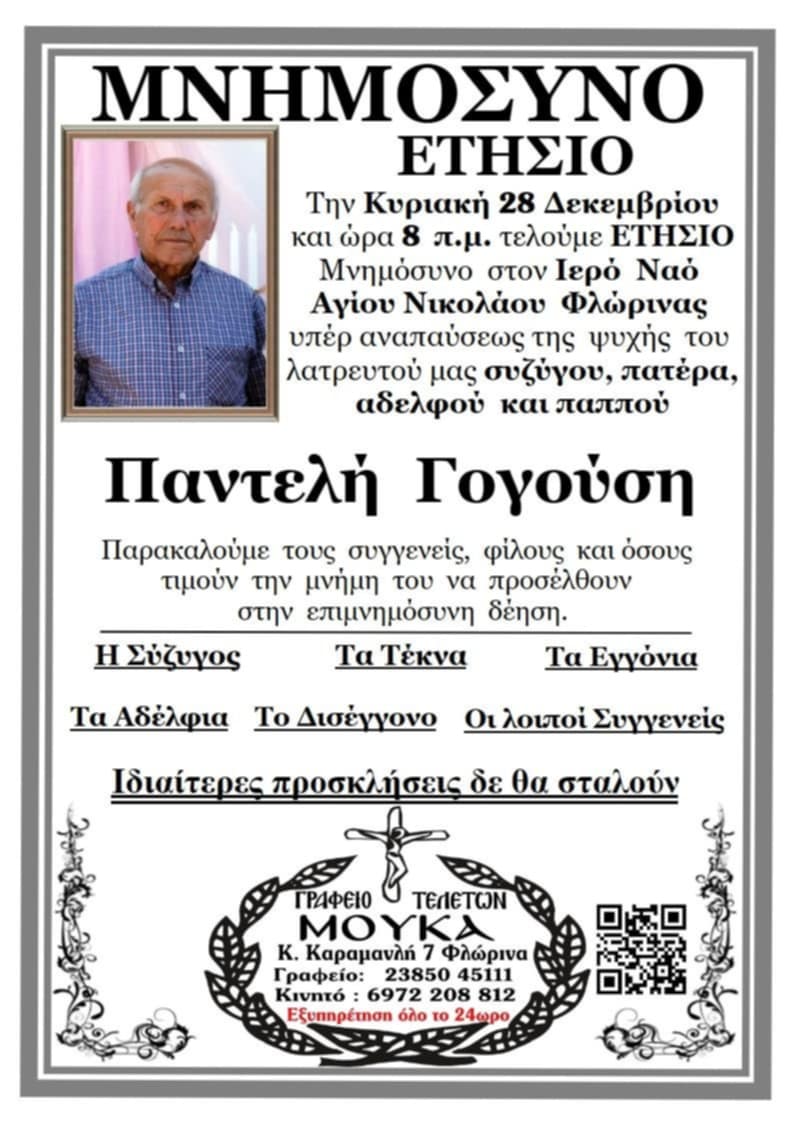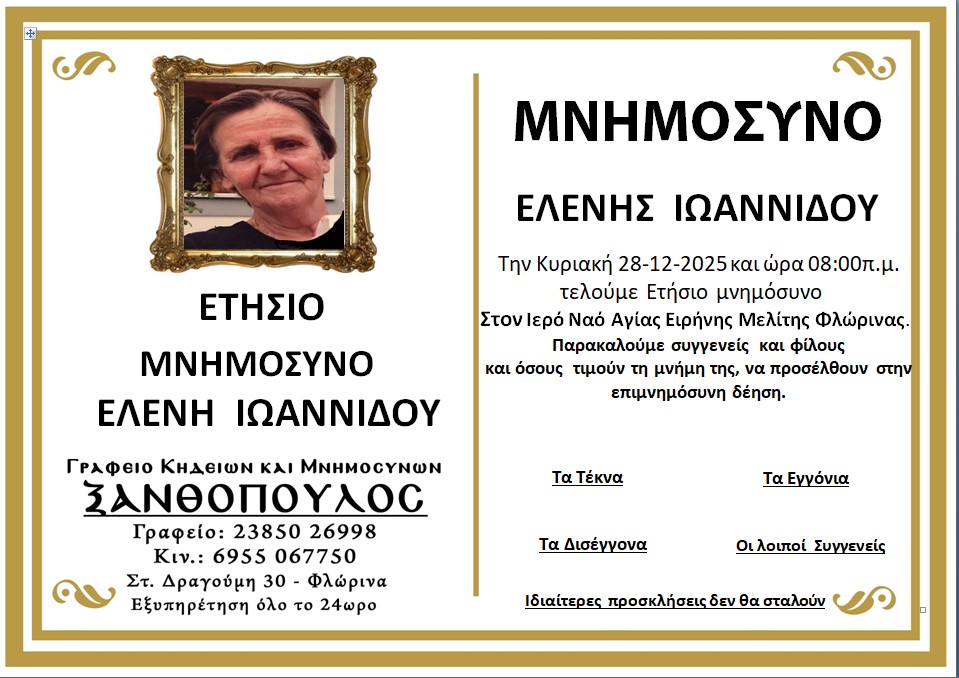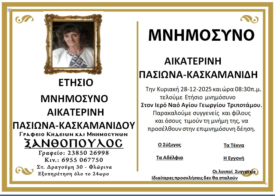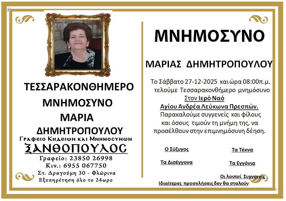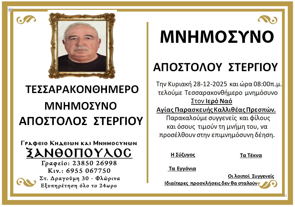ΚοινωνικάΜνημόσυνα Σαββάτου 27 και Κυριακής 28 Δεκεμβρίου Παρασκευή 26 Δεκεμβρίου, 2025 21:27 florinapress.gr SHARE Ίσως να ενδιαφέρει ... Ενημέρωση ενδιαφερόμενων μαθητών, υποψηφίων πολυτεχνικών σχολών, για το επιστημονικό περιεχόμενο και τις επαγγελματικές διεξόδους των πολυτεχνικών σχολών Εσπερινό Γυμνάσιο-Λύκειο: ευχές εν όψει του Πάσχα Κηδεία της Ασπασίας Δούμτση, ετών 85 Κηδεία του Νικολάου Γεωργίου, ετών 65 Πρόγραμμα Αγώνων Β’ Φάσης Κυπέλλου ΕΠΣ Φλώρινας Share Ακολουθήστε μας8.4kFollowersLikeΤελευταία νέα Εγκαίνια της έκθεσης επιχρωματισμένης φωτογραφίας: «Η Φλώρινα στις αρχές του 20ου αιώνα» του Ηλία Ιωανννίδη Εκδηλώσεις Πολιτισμός Παρασκευή 26 Δεκεμβρίου, 2025 Πραγματοποιήθηκε ο ετήσιος χορός του Α.Σ. Άρης Λόφων Εκδηλώσεις Πολιτισμός Παρασκευή 26 Δεκεμβρίου, 2025 Με γιορτή σοκολάτας και δράσεις για παιδιά συνεχίζονται οι Χριστουγεννιάτικες εκδηλώσεις του Δήμου Φλώρινας Εκδηλώσεις Πολιτισμός Παρασκευή 26 Δεκεμβρίου, 2025 Κυπριακή ντοπιολαλιά, ελληνική διάλεκτος η καθομιλουμένη στην Κύπρο. Λέξεις Κοινωνία Παρασκευή 26 Δεκεμβρίου, 2025