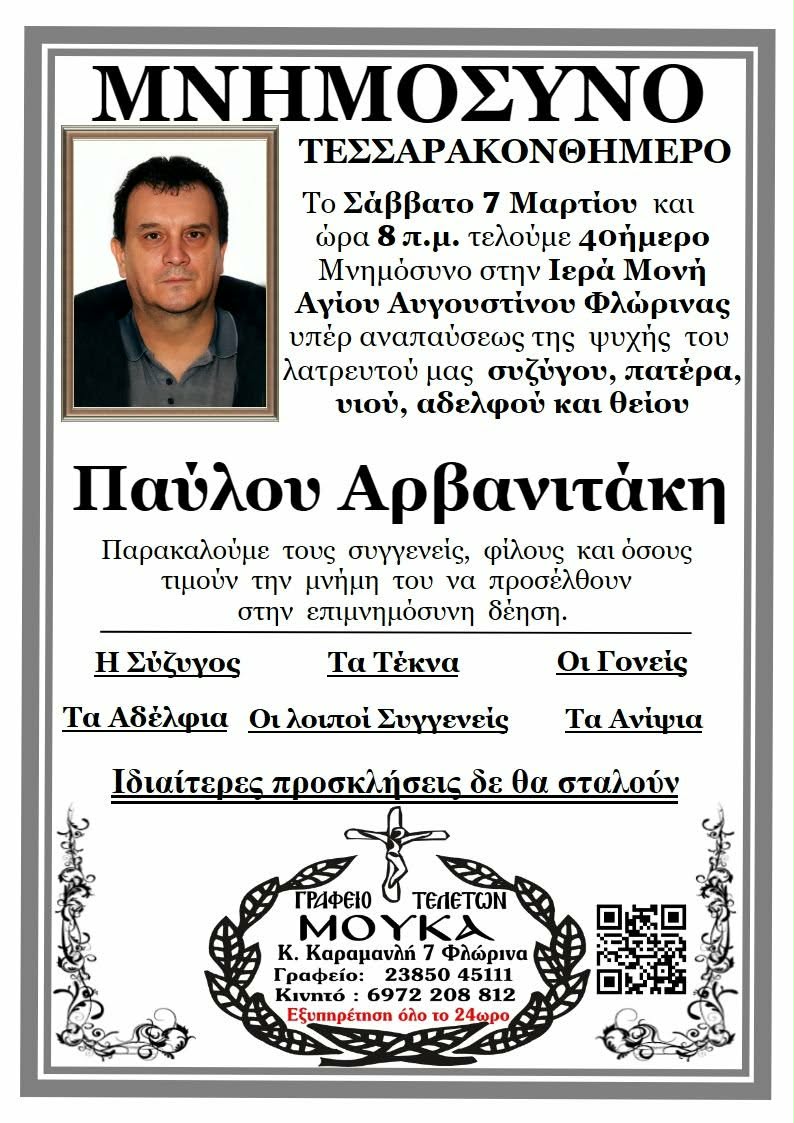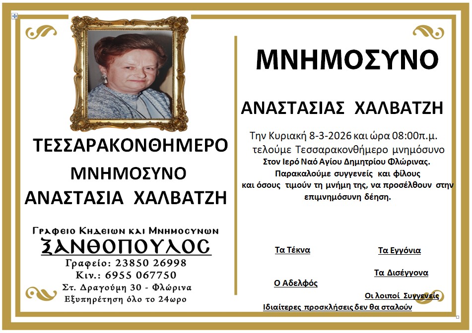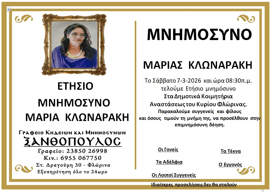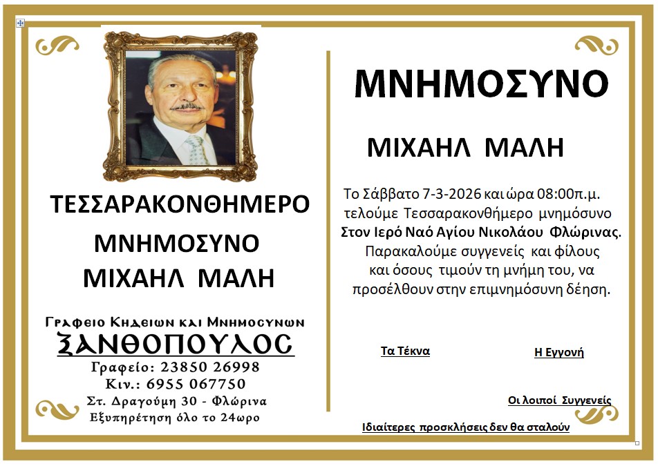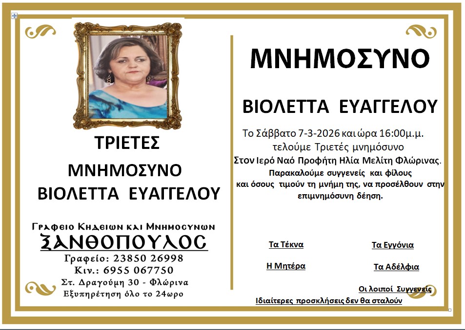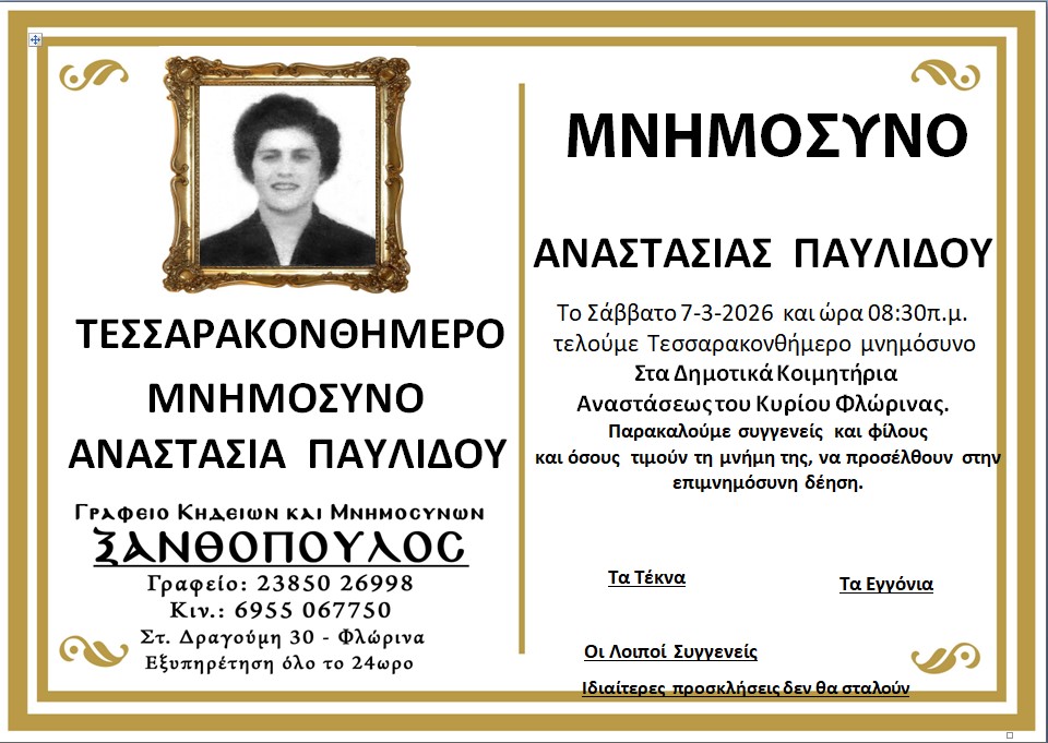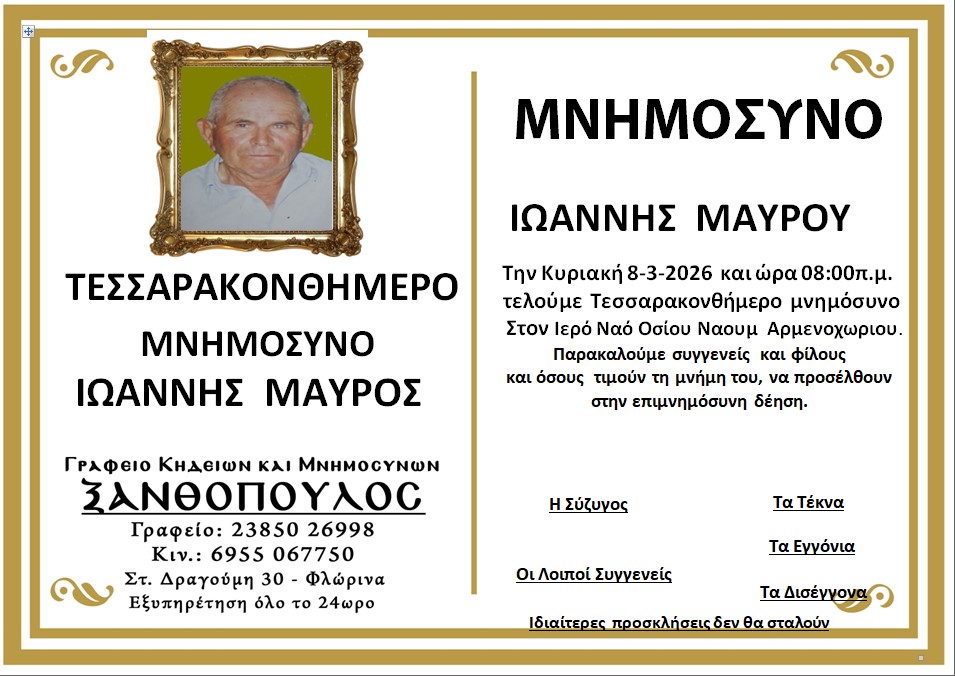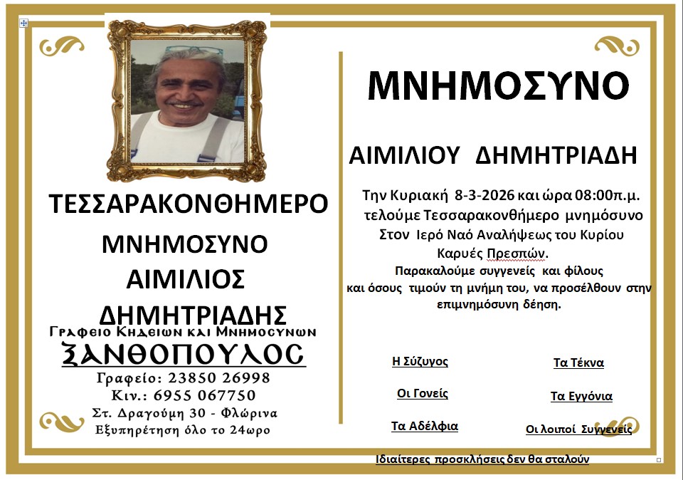 ΚοινωνικάΜνημόσυνα Σαββάτου 7 και Κυριακής 8 Μαρτίου Παρασκευή 6 Μαρτίου, 2026 14:24 florinapress.gr SHARE Ίσως να ενδιαφέρει ... Ερώτηση του βουλευτή Α. Αβδελά με θέμα: «Αρκούδες καταστρέφουν κερασιές και μελίσσια στην Φλώρινα» Κηδεία της Σοφίας Ματσκαλίδου, ετών 90 Συνάντηση καθηγητών φυσικής αγωγής αποφοίτησης 1972 Επίσκεψη του Βουλευτή Γιάννη Αντωνιάδη στην τοπική κοινότητα Αετού του δήμου Αμυνταίου Δραστηριοποίηση πωλητών λαϊκής αγοράς και παράλληλης λαϊκής αγοράς Δήμου Φλώρινας την Τετάρτη Share Ακολουθήστε μας8.4kFollowersLikeΤελευταία νέα Εθιμοτυπική συνάντηση του Γενικού Περιφερειακού Αστυνομικού Διευθυντή Δυτικής Μακεδονίας με τον Δήμαρχο Αμυνταίου Πολιτική Παρασκευή 6 Μαρτίου, 2026 Ευχαριστήριο του Γυμνασίου Αετού Κοινωνία Παρασκευή 6 Μαρτίου, 2026 Πόλεμος στη Μέση Ανατολή: Επιπτώσεις και Στρατηγικές Επιλογές για την Ελλάδα Πολιτική Παρασκευή 6 Μαρτίου, 2026 Νέο πρόγραμμα κατάρτισης της Δημόσιας Υπηρεσίας Απασχόλησης για εργαζομένους του ιδιωτικού τομέα Κοινωνία Παρασκευή 6 Μαρτίου, 2026