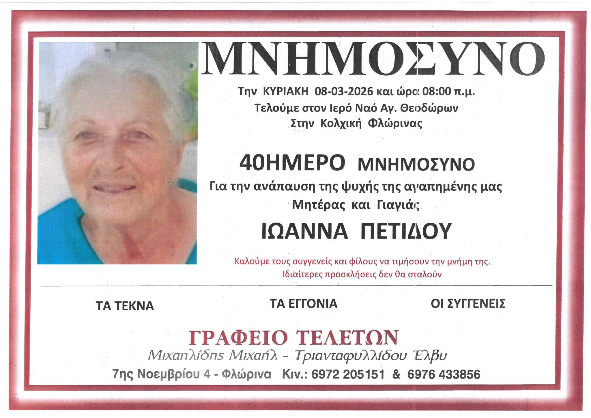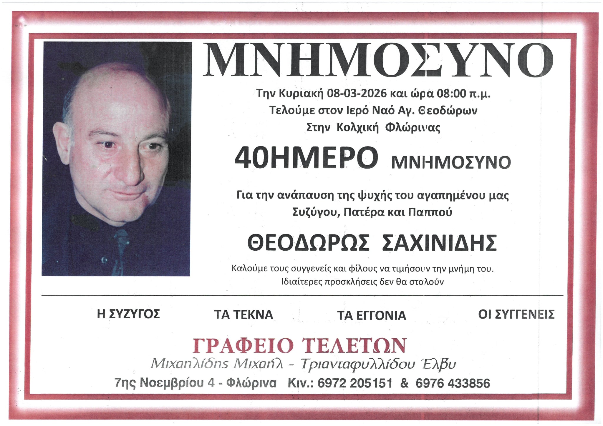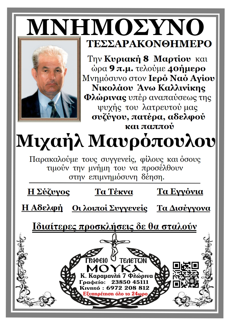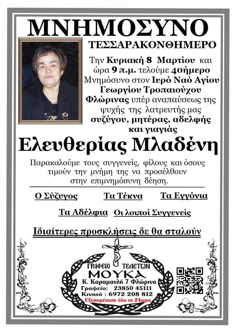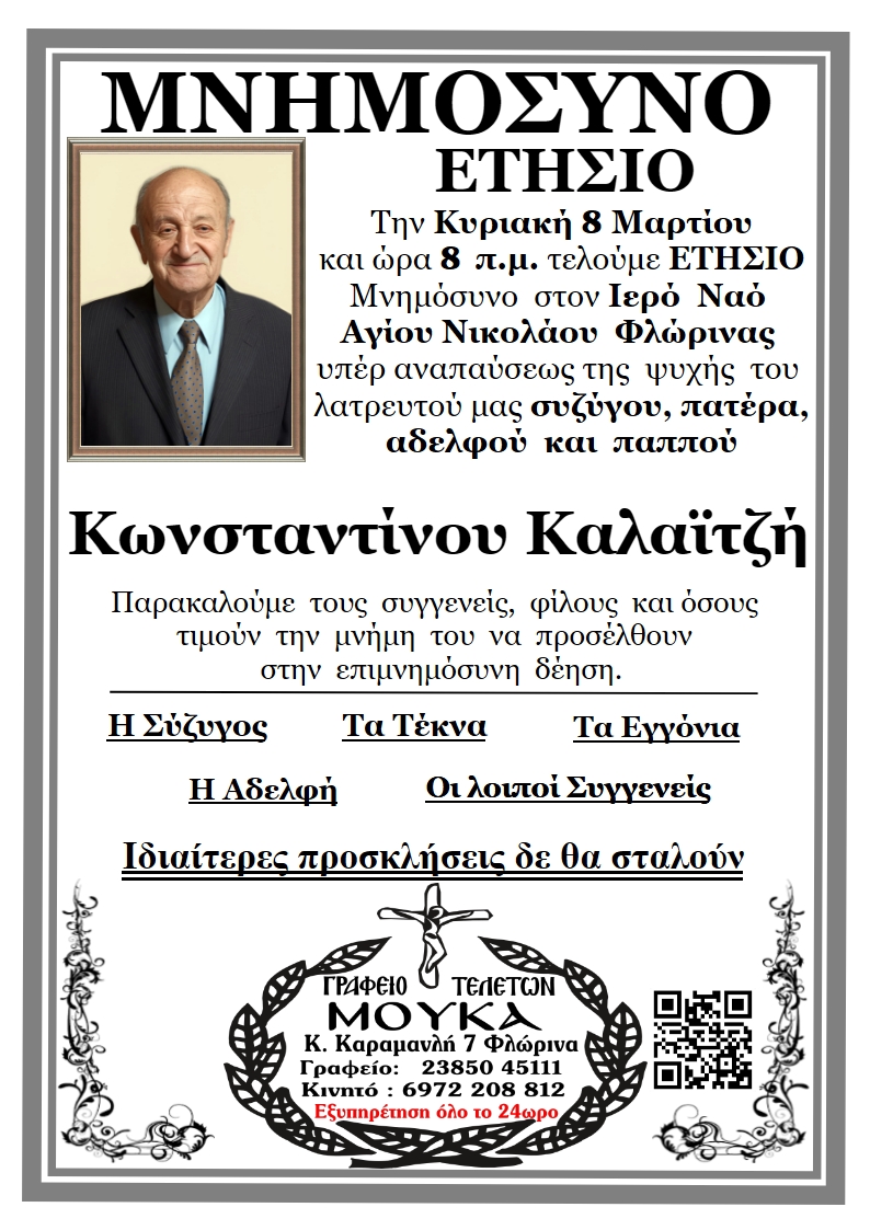 ΚοινωνικάΜνημόσυνα Σαββάτου 7 και Κυριακής 8 Μαρτίου Παρασκευή 6 Μαρτίου, 2026 14:24 florinapress.gr SHARE Ίσως να ενδιαφέρει ... Ερώτηση του βουλευτή Α. Αβδελά με θέμα: «Αρκούδες καταστρέφουν κερασιές και μελίσσια στην Φλώρινα» Κηδεία της Σοφίας Ματσκαλίδου, ετών 90 Συνάντηση καθηγητών φυσικής αγωγής αποφοίτησης 1972 Επίσκεψη του Βουλευτή Γιάννη Αντωνιάδη στην τοπική κοινότητα Αετού του δήμου Αμυνταίου Δραστηριοποίηση πωλητών λαϊκής αγοράς και παράλληλης λαϊκής αγοράς Δήμου Φλώρινας την Τετάρτη Share Ακολουθήστε μας8.4kFollowersLikeΤελευταία νέα Εθιμοτυπική συνάντηση του Γενικού Περιφερειακού Αστυνομικού Διευθυντή Δυτικής Μακεδονίας με τον Δήμαρχο Αμυνταίου Πολιτική Παρασκευή 6 Μαρτίου, 2026 Ευχαριστήριο του Γυμνασίου Αετού Κοινωνία Παρασκευή 6 Μαρτίου, 2026 Πόλεμος στη Μέση Ανατολή: Επιπτώσεις και Στρατηγικές Επιλογές για την Ελλάδα Πολιτική Παρασκευή 6 Μαρτίου, 2026 Νέο πρόγραμμα κατάρτισης της Δημόσιας Υπηρεσίας Απασχόλησης για εργαζομένους του ιδιωτικού τομέα Κοινωνία Παρασκευή 6 Μαρτίου, 2026