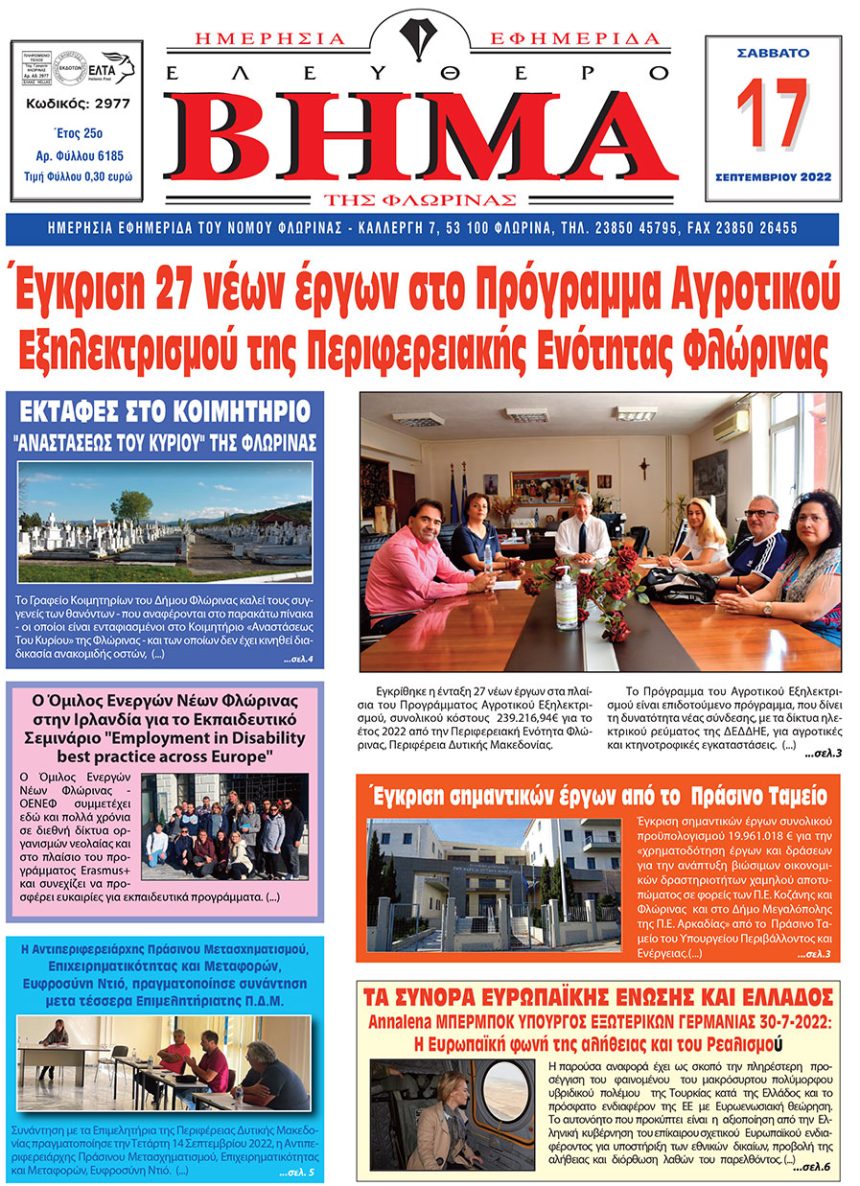 ΠρωτοσέλιδαΠρωτοσέλιδοΠρωτοσέλιδο 17/9/22 Παρασκευή 16 Σεπτεμβρίου, 2022 23:00 florinapress.gr SHARE Ίσως να ενδιαφέρει ... ΕΛΕΥΘΕΡΟ ΒΗΜΑ ΤΗΣ ΦΛΩΡΙΝΑΣ 9/2/2013 Πρωτοσέλιδο εφημερίδας “ελεύθερο βήμα της Φλώρινας” – 11/4/24 ΕΛΕΥΘΕΡΟ ΒΗΜΑ ΤΗΣ ΦΛΩΡΙΝΑΣ 14/2/2014 Πρωτοσέλιδο Πρωτοσέλιδο – Ελεύθερο Βήμα της Φλώρινας – 15/4/22 Share Ακολουθήστε μας8.4kFollowersLikeΤελευταία νέα Επίσκεψη του Αντιπεριφερειάρχη Φλώρινας Αθανάσιου Τάσκα στις Πρέσπες στο πλαίσιο των εορτών των Χριστουγέννων και της Πρωτοχρονιάς Πολιτική Πέμπτη 18 Δεκεμβρίου, 2025 Με την “Γιορτή Ζαχαρωτών” συνεχίστηκαν οι Χριστουγεννιάτικες εκδηλώσεις του Δήμου Φλώρινας Εκδηλώσεις Πολιτισμός Πέμπτη 18 Δεκεμβρίου, 2025 Θέση εργασίας στη Φλώρινα Κοινωνία Πέμπτη 18 Δεκεμβρίου, 2025 Χριστουγεννιάτικη εκδήλωση για τα παιδιά του Δήμου Αμυνταίου Εκδηλώσεις Πολιτισμός Πέμπτη 18 Δεκεμβρίου, 2025