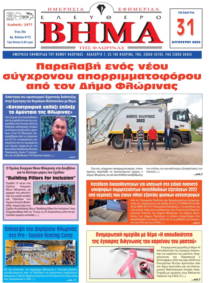 ΠρωτοσέλιδαΠρωτοσέλιδοΠρωτοσέλιδο 31/8/22 Τρίτη 30 Αυγούστου, 2022 22:01 florinapress.gr SHARE Ίσως να ενδιαφέρει ... Πρωτοσέλιδο Ελεύθερο βήμα της Φλώρινας 1/6/22 ΕΛΕΥΘΕΡΟ ΒΗΜΑ ΤΗΣ ΦΛΩΡΙΝΑΣ 26/6/2014 ΕΛΕΥΘΕΡΟ ΒΗΜΑ ΤΗΣ ΦΛΩΡΙΝΑΣ (20/4/2016) Πρωτοσέλιδο ΠΡΩΤΟΣΕΛΙΔΟ Share Ακολουθήστε μας8.4kFollowersLikeΤελευταία νέα Η Χριστουγεννιάτικη γιορτή της Σχολής Κοινωνικών και Ανθρωπιστικών Επιστημών Εκδηλώσεις Πολιτισμός Σάββατο 20 Δεκεμβρίου, 2025 Ευχές του Συνδέσμου Εφέδρων Αξιωματικών Ν. Φλωρίνης Πολιτισμός Σάββατο 20 Δεκεμβρίου, 2025 Χριστουγεννιάτικη συνάντηση Γρηγόρη Δημητριάδη με την οικογένεια της ΟΝΝΕΔ Πολιτική Σάββατο 20 Δεκεμβρίου, 2025 Ευχαριστήριο του 2ου Γυμνασίου Φλώρινας προς το ΚΕ.Δ.Α.Σ.Υ. Φλώρινας Κοινωνία Σάββατο 20 Δεκεμβρίου, 2025