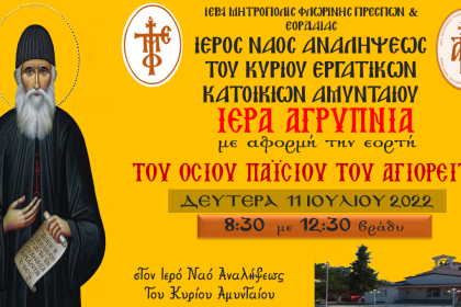 Ιερά Αγρυπνία εορτής Οσίου Παΐσιου του Αγιορείτου στον Ι.Ν. Αναλήψεως του Κυρίου Αμυνταίου την Δευτέρα 11/07 το βράδυ