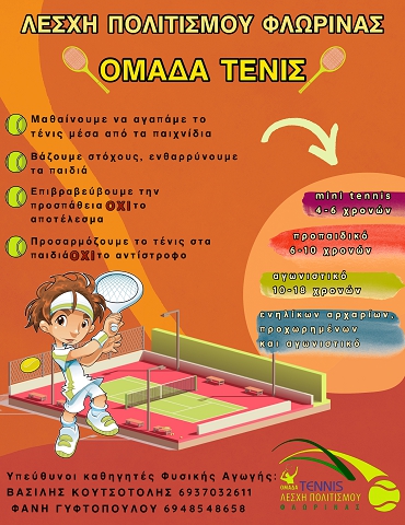 Η καλύτερη εποχή να ξεκινήσετε το ιδανικότερο σπορ με τη νέα καλοκαιρινή προσφορά της μεγαλύτερης και πιο πετυχημένης Ακαδημίας τένις στην πόλη μας. Εδώ τα παιδιά γνωρίζουν το άθλημα της αντισφαίρισης, εμπλουτίζουν τις κινητικές και συναρμοστικές τους ικανότητες, μαθαίνουν τη βασική τεχνική και τακτική του παιχνιδιού, αθλούνται και κοινωνικοποιούνται με στόχο την ανάδειξη των δεξιοτήτων τους την ψυχαγωγία και την διασκέδασή τους . Όλα αυτά παρέχονται με την καθοδήγηση, τη γνώση και την εμπειρία μας και σύμφωνα με τα εκπαιδευτικά συστήματα της παγκόσμιας ομοσπονδίας I.T.F σε ένα ευχάριστο, ασφαλές και φιλικό περιβάλλον .