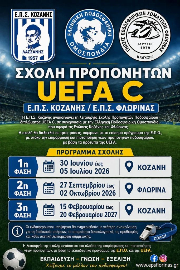 ΑθλητισμόςΣχολή προπονητών UEFA-C από ΕΠΣ Κοζάνης / ΕΠΣ Φλώρινας Πέμπτη 23 Απριλίου, 2026 21:41 florinapress.gr SHARE ΓΙΑ ΠΕΡΙΣΣΟΤΕΡΕΣ ΠΛΗΡΟΦΟΡΙΕΣ (ΕΠΣ ΦΛΩΡΙΝΑΣ): 2385023600Ίσως να ενδιαφέρει ... Ολοκληρώθηκαν οι Χριστουγεννιάτικες εκδηλώσεις του Δήμου Φλώρινας Η διήμερη ορειβατική εκδρομή του ΦΟΟΦ στην Αχρίδα και τον Όσιο Ναούμ «Ξεκινά ο Νέος Μαραθώνιος» Μήνυμα του Α.Π.Σ. Φλώρινας SHOGUN για την έναρξη του σχολικού έτους 2021-2022 Θερμά συγχαρητήρια στον μαθητή Αγαθάγγελο Παπαδόπουλο για τη σπουδαία του διάκριση! Share Ακολουθήστε μας8.4kFollowersLikeΤελευταία νέα Διακοπή ηλεκτροδότησης στη ΒΙΠΕ Φλώρινας και σε Τ.Κ. Δήμου Φλώρινας Κοινωνία Πέμπτη 23 Απριλίου, 2026 Χρηστίδειος Τελετή 2026: Ευχαριστίες και συγχαρητήρια από τη Διεύθυνση Δευτεροβάθμιας Εκπαίδευσης Φλώρινας Κοινωνία Πέμπτη 23 Απριλίου, 2026 Κηδεία της Μαρίας Τόλη, ετών 89 Κοινωνικά Πέμπτη 23 Απριλίου, 2026 Σταύρος Παπασωτηρίου: Χαιρετισμός θεματικής Ημερίδας «Φλώρινα: Τουρισμός με Ταυτότητα – Χτίζοντας έναν Αυθεντικό Προορισμό» Πολιτική Πέμπτη 23 Απριλίου, 2026