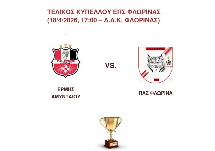 Το Σάββατο 18/4/2026 θα λάβει χώρα ο Τελικός Κυπέλλου ΕΠΣ Φλώρινας αγωνιστικής περιόδου 2025-2026 ανάμεσα στις ομάδες ΕΡΜΗΣ ΑΜΥΝΤΑΙΟΥ και ΠΑΣ ΦΛΩΡΙΝΑ στο Δ.Α.Κ. Φλώρινας. Ο αγώνας ξεκινάει στις 17:00.