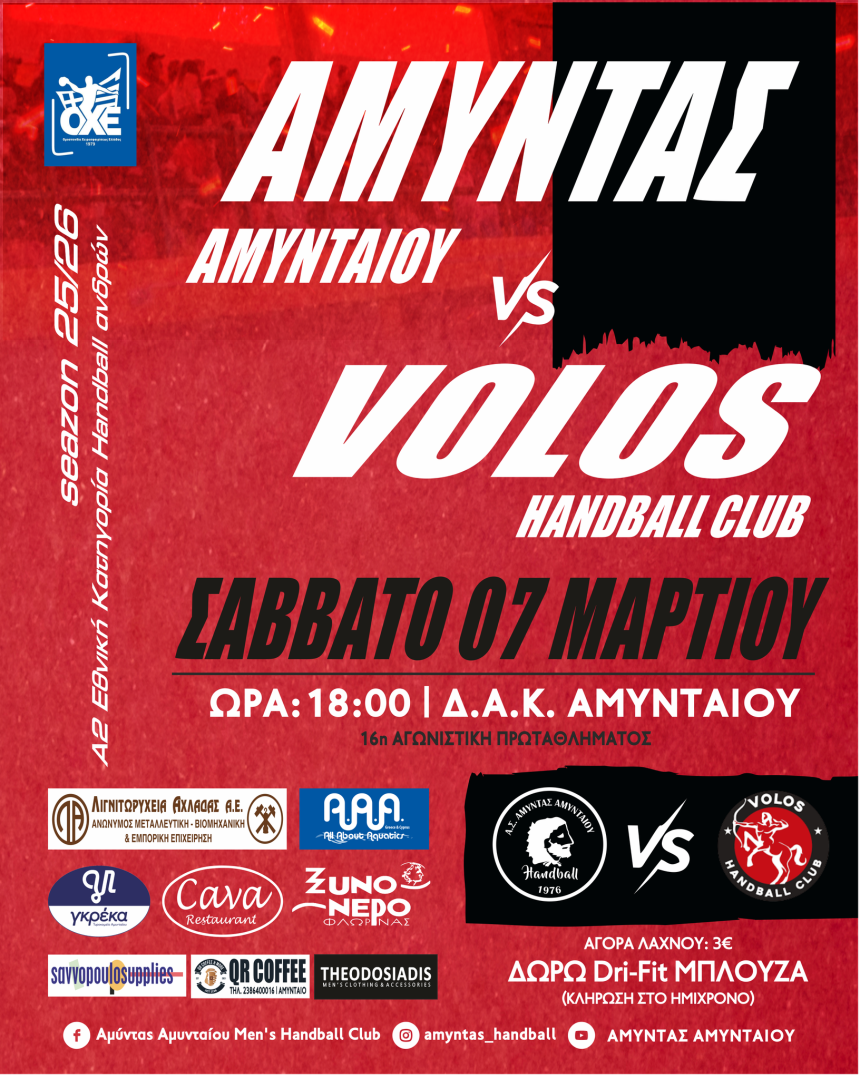 Ο Αμύντας Αμυνταίου μπαίνει στην τελική ευθεία του Πρωταθλήματος της Α2 Ανδρών, με τρεις αγωνιστικές να απομένουν για την ολοκλήρωση της κανονικής διάρκειας. Το Σάββατο 7 Μαρτίου 2026 η ομάδα μας υποδέχεται στις 18:00 στο ΔΑΚ Αμυνταίου τον Βόλο Α.Ο.Χ., σε έναν αγώνα με τεράστια βαθμολογική σημασία.