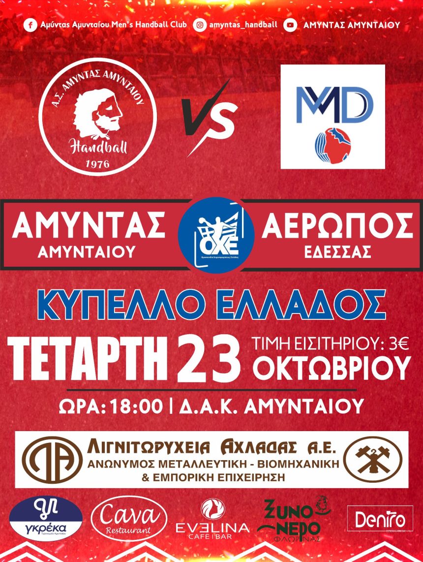 Στη μάχη του Κυπέλλου Ελλάδος Ανδρών ρίχνεται απόψε Τετάρτη 23 Οκτωβρίου 2024, η ανδρική ομάδα του Αμύντα Αμυνταίου, καθώς στις 18:00 φιλοξενεί στο ΔΑΚ Αμυνταίου τον Αερωπό Έδεσσας στο πλαίσιο της Α΄ φάσης του θεσμού.