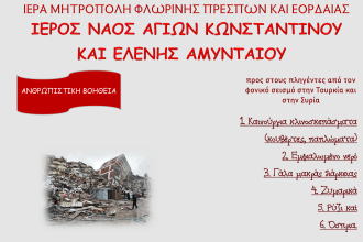 Συγκέντρωση ανθρωπιστικής βοήθειας στους πληγέντες του φονικού σεισμού σε Τουρκία και Συρία από τον Ι.Ν. Αγ. Κων/νου και Ελένης Αμυνταίου