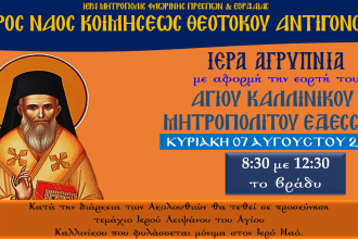 Ιερά Αγρυπνία με αφορμή την εορτή του Αγίου Καλλινίκου Μητροπολίτου Εδέσσης
