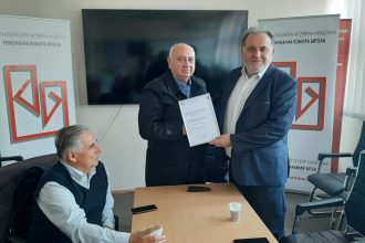 Τιμητική πλακέτα στον πρόεδρο του Επιμελητηρίου Φλώρινας από τον πρόεδρο του Επιμελητηρίου Μπίτολα