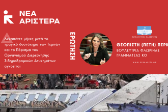 Πέτη Πέρκα: «15 μήνες μετά το τραγικό δυστύχημα των Τεμπών και το Πόρισμα του Οργανισμού Διερεύνησης Σιδηροδρομικών Ατυχημάτων αγνοείται»