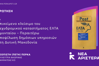 Ερώτηση Βουλευτών της Νέας Αριστεράς σχετικά με το επικείμενο κλείσιμο του ταχυδρομικού καταστήματος ΕΛΤΑ Αμυνταίου