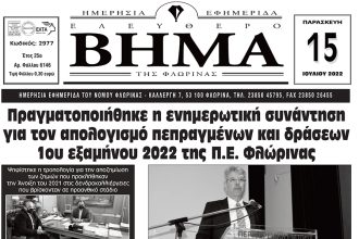 Πρωτοσέλιδο Ελεύθερο βήμα της Φλώρινας 15/7/22