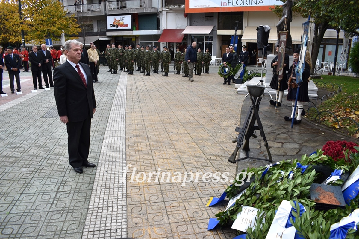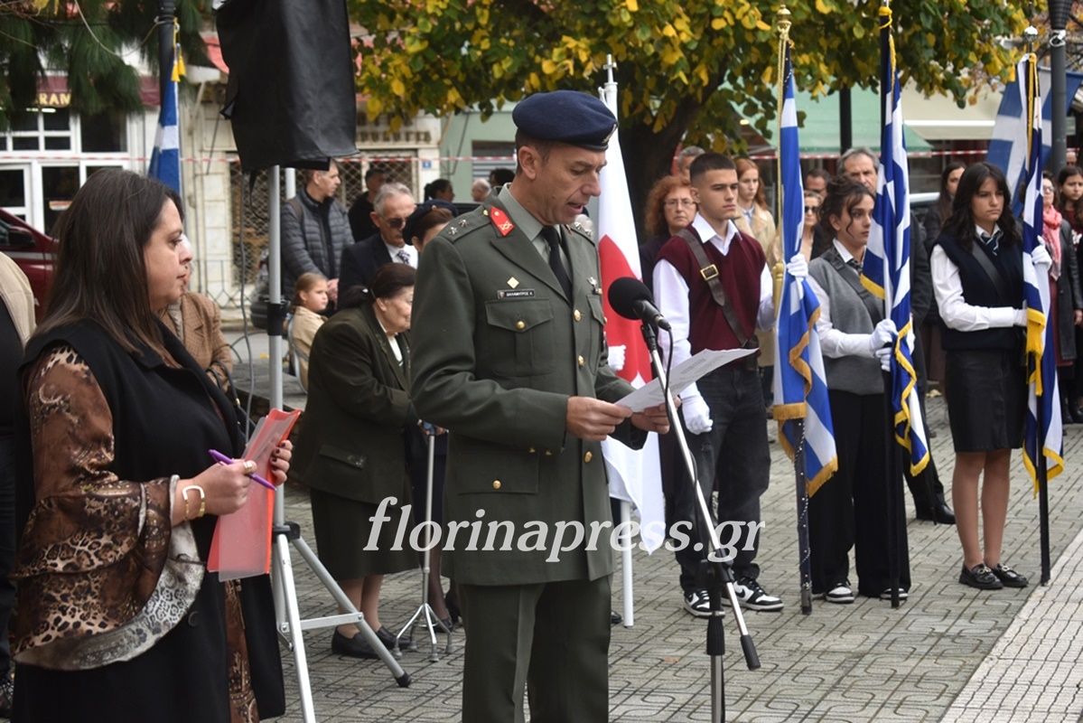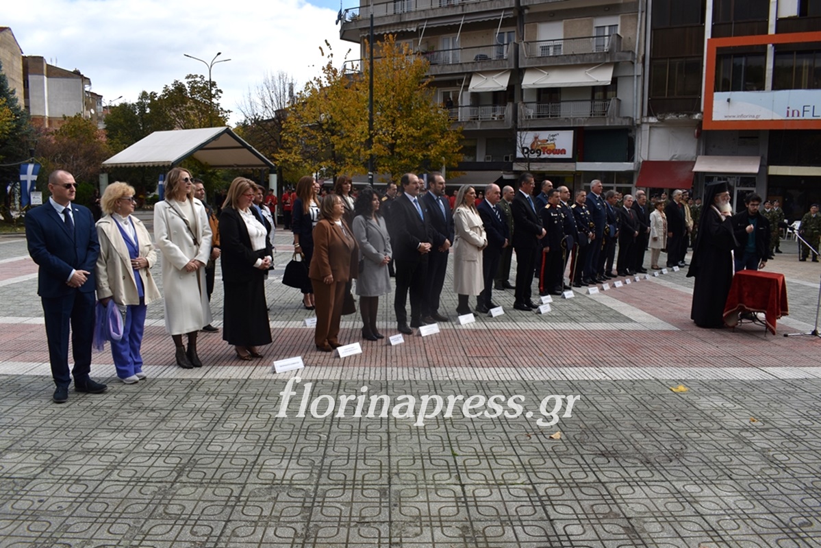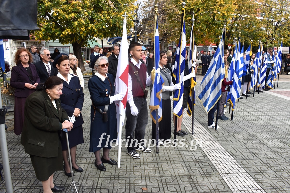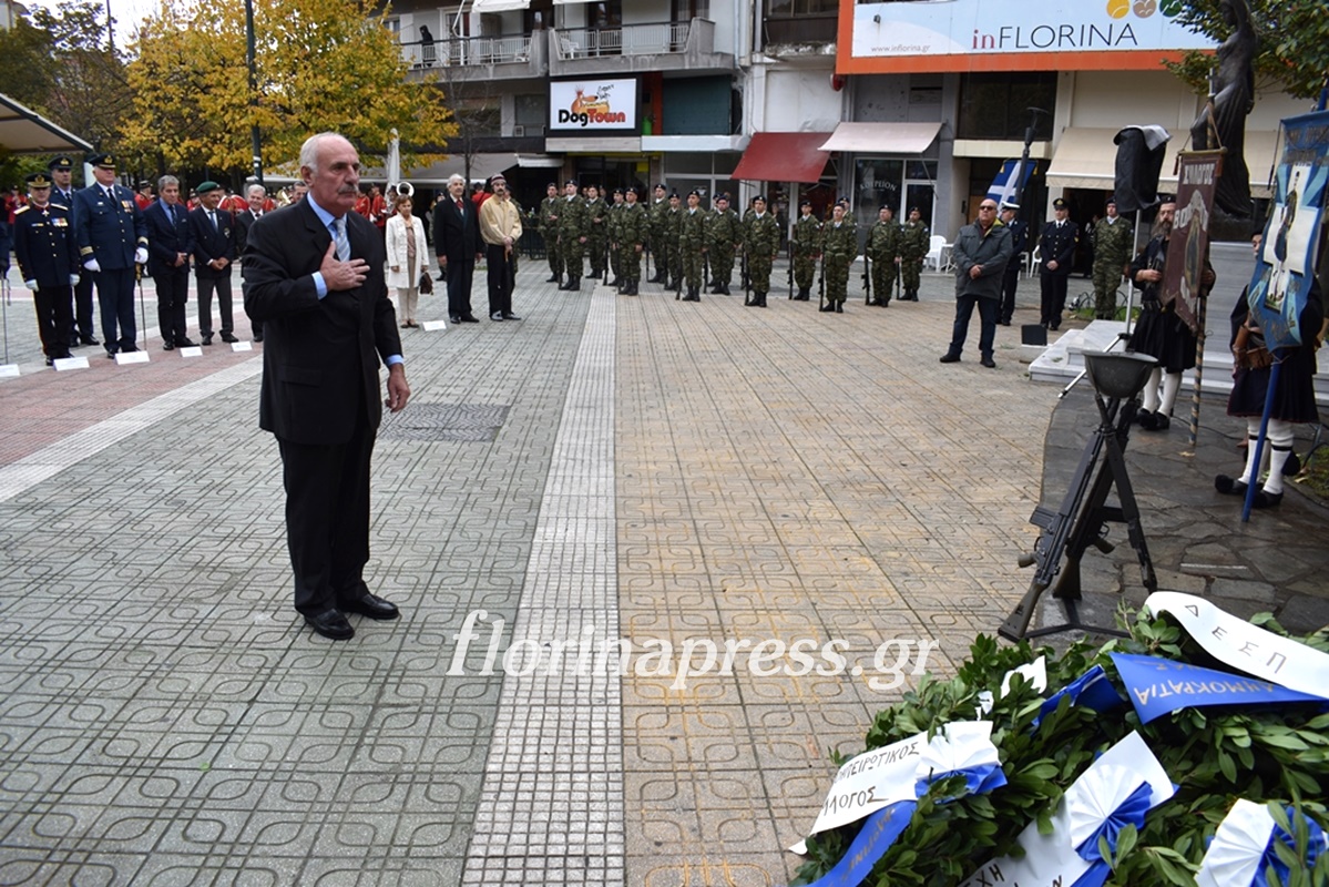 Πριν τη μαθητική και στρατιωτική παρέλαση στη Λεωφόρο Μακεδονομάχων, τελέστηκε επιμνημόσυνη δέηση στο μνημείο της πλατείας Γεωργίου Μόδη και ακολούθησε προσκλητήριο πεσόντων Φλωρινιωτών κατά τον πόλεμο του 1940 – 41, κατάθεση στεφάνων και η ανάκρουση του εθνικού ύμνου.