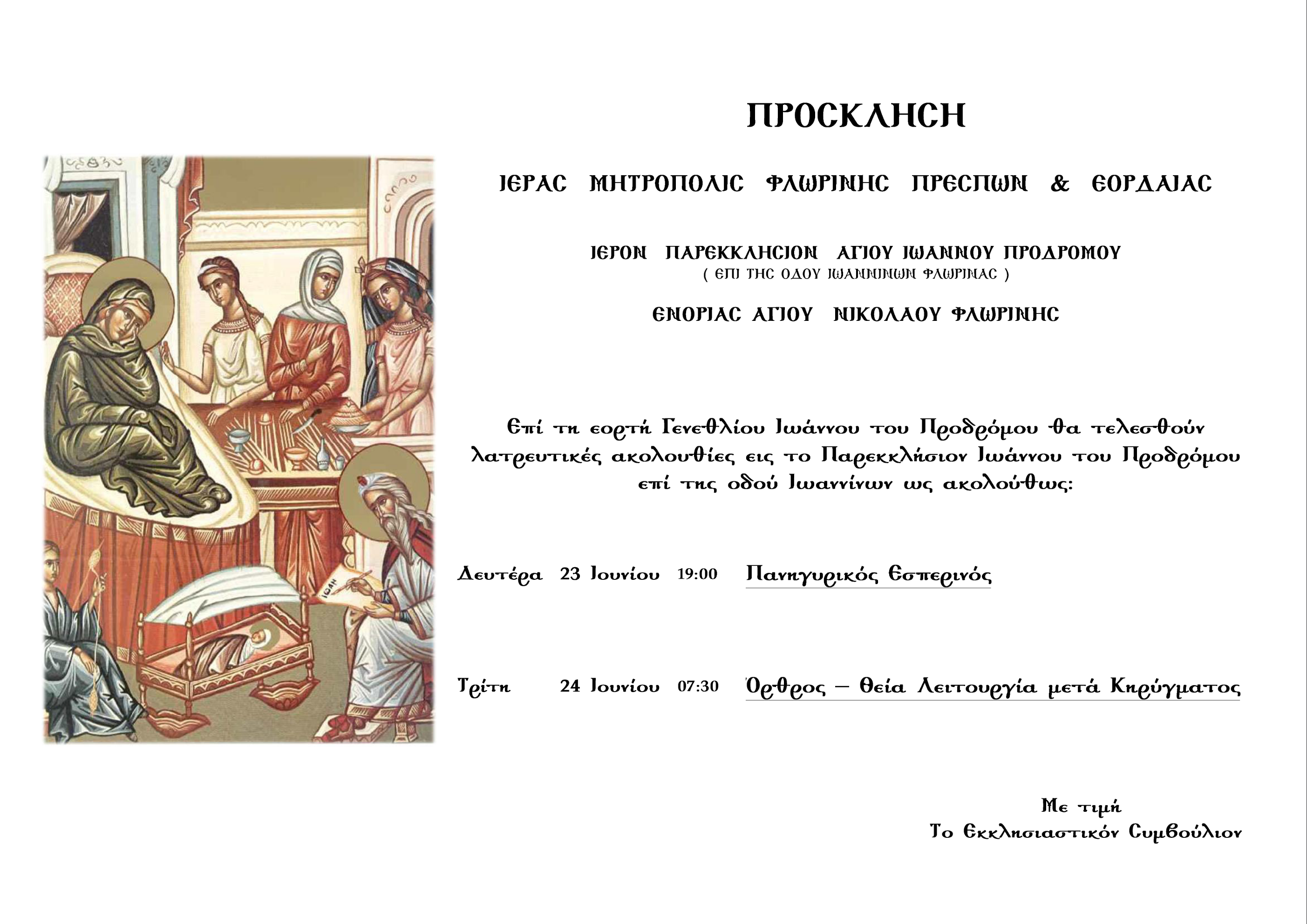 ΚοινωνίαΠρόσκληση Γενεθλίου Ιωάννου Προδρόμου Παρασκευή 20 Ιουνίου, 2025 22:15 florinapress.gr SHARE Ίσως να ενδιαφέρει ... Λήγει η προθεσμία υποβολής αιτήσεων για τις εγγραφές στα Μουσικά Σχολεία στις 29 Μαΐου Επέκταση σε όλη την Επικράτεια, της ισχύος των έκτακτων και προσωρινών μέτρων, ως προς την οργάνωση του τόπου και του χρόνου εργασίας Μηνιαίος απολογισμός της Γενικής Περιφερειακής Αστυνομικής Διεύθυνσης Δυτικής Μακεδονίας στην Οδική Ασφάλεια Συγχαρητήριο του Βουλευτή Π.Ε. Φλώρινας Γιάννη Αντωνιάδη στον Ερμή Αμυνταίου Με πρωτοβουλία του Κώστα Σημίτη ιδρύθηκε το Πάρκο Πρεσπών Share Ακολουθήστε μας8.4kFollowersLikeΤελευταία νέα ΑΔΕΔΥ Ν. Φλώρινας: Στήριξη του αγώνα των αγροτών & κτηνοτρόφων! Κοινωνία Δευτέρα 15 Δεκεμβρίου, 2025 Πραγματοποιήθηκε η 2η Πανελλήνια Χειμερινή Ορειβατική Συνάντηση στην Φλώρινα Αθλητισμός Δευτέρα 15 Δεκεμβρίου, 2025 Με μεγάλη επιτυχία πραγματοποιήθηκε η βραδιά “Soup & Wine” στο Οινοεκθετήριο Αμυνταίου Εκδηλώσεις Πολιτισμός Δευτέρα 15 Δεκεμβρίου, 2025 Χριστουγεννιάτικη θεατρική παράσταση του ΚΔΑΠ ΜΕΑ Δήμου Φλώρινας Εκδηλώσεις Πολιτισμός Δευτέρα 15 Δεκεμβρίου, 2025