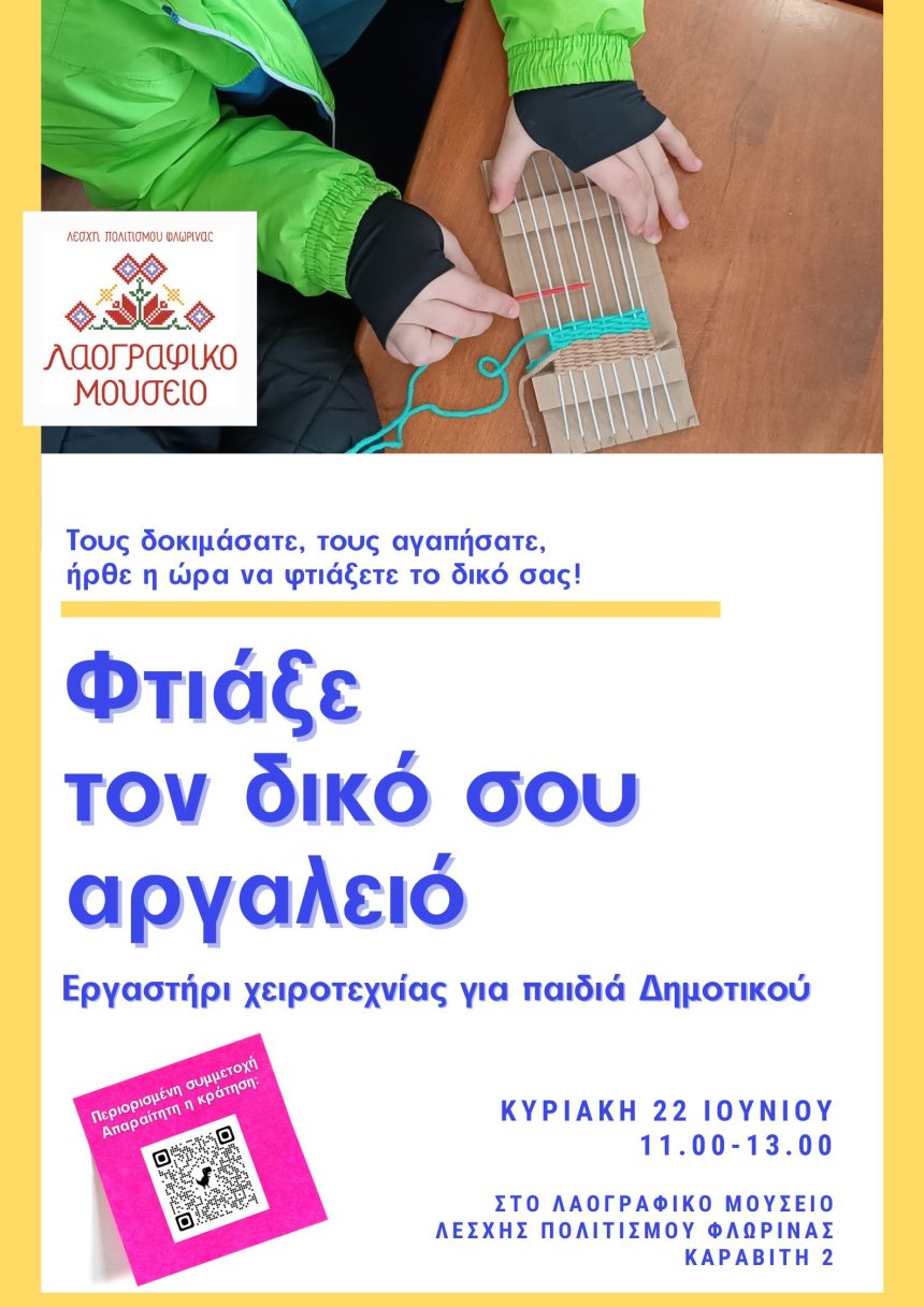 Το Λαογραφικό Μουσείο της Λέσχης Πολιτισμού Φλώρινας διοργανώνει ένα δημιουργικό εργαστήριο αργαλειού για παιδιά, με στόχο να γνωρίσουν από κοντά την παραδοσιακή τέχνη της υφαντικής μέσα από το παιχνίδι.