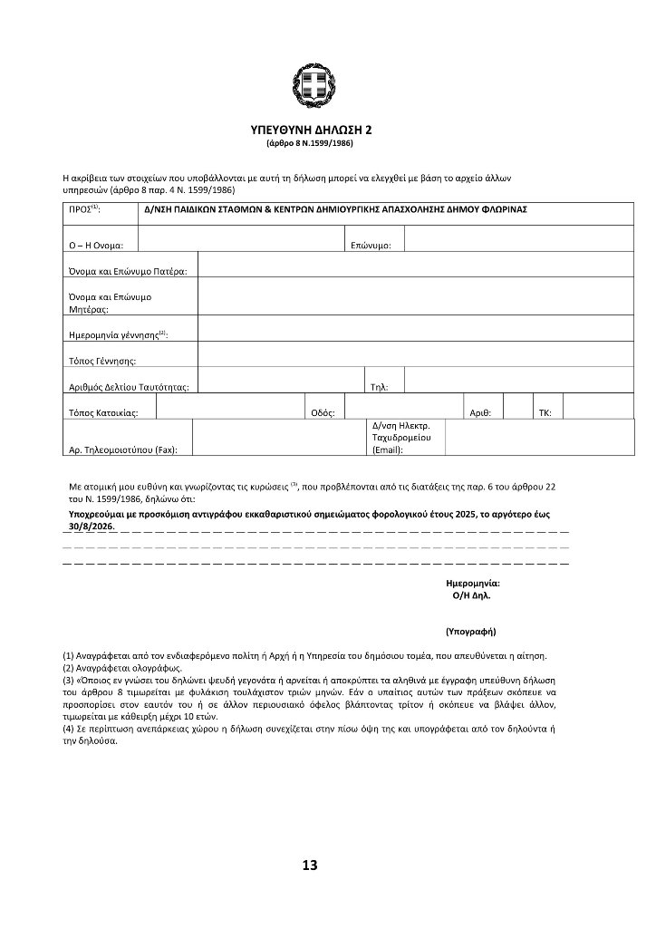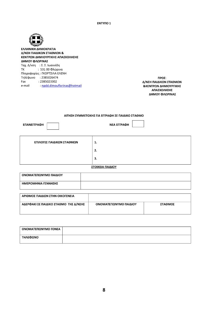 Αγαπητοί γονείς και κηδεμόνες σας ενημερώνουμε ότι οι αιτήσεις για την εγγραφή και για την επανεγγραφή των νηπίων στους Παιδικούς Σταθμούς του Δήμου Φλώρινας ξεκινά από τις 11/05/2026 έως και 29/05/2026 από 09.00 π.μ. έως 13:30 μ.μ. καθημερινά.