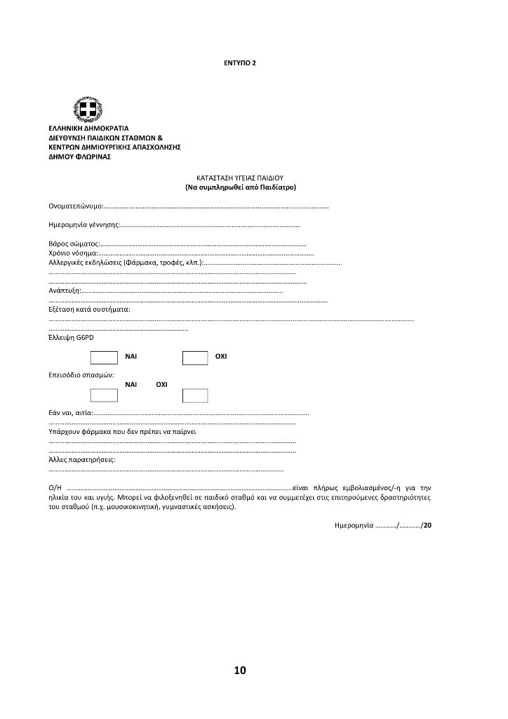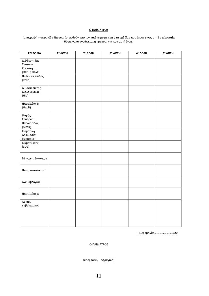 - Ατομικό Δελτίο Υγείας, συμπληρωμένο από παιδίατρο με πλήρη στοιχεία εμβολιασμών, ημερομηνίες και το αποτέλεσμα της φυματοαντίδρασης (mantoux), όπως κάθε φορά προβλέπεται από το Εθνικό Πρόγραμμα Εμβολιασμών.