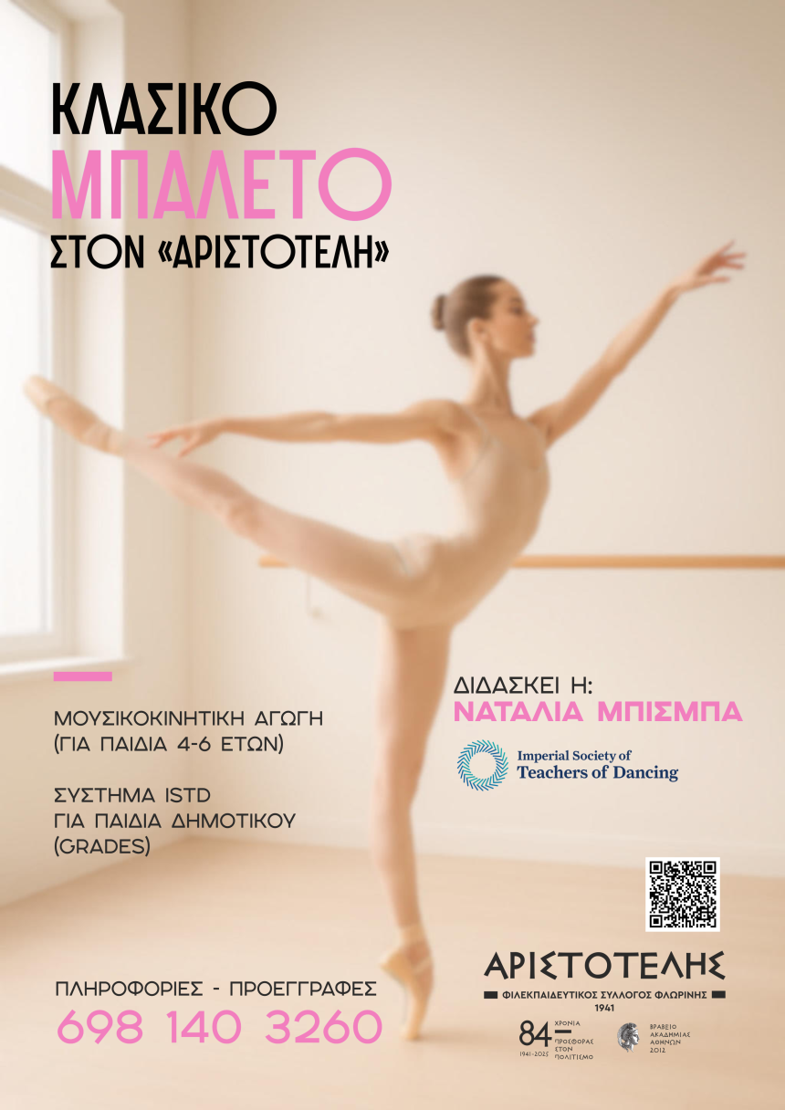 Οι εγγραφές στο Τμήμα Κλασικού Μπαλέτου του Φ.Σ.Φ. «Ο Αριστοτέλης» θα ξεκινήσουν την 1η Σεπτεμβρίου 2025 τις ώρες 18:00-20:00 στην αίθουσα χορού του Συλλόγου.