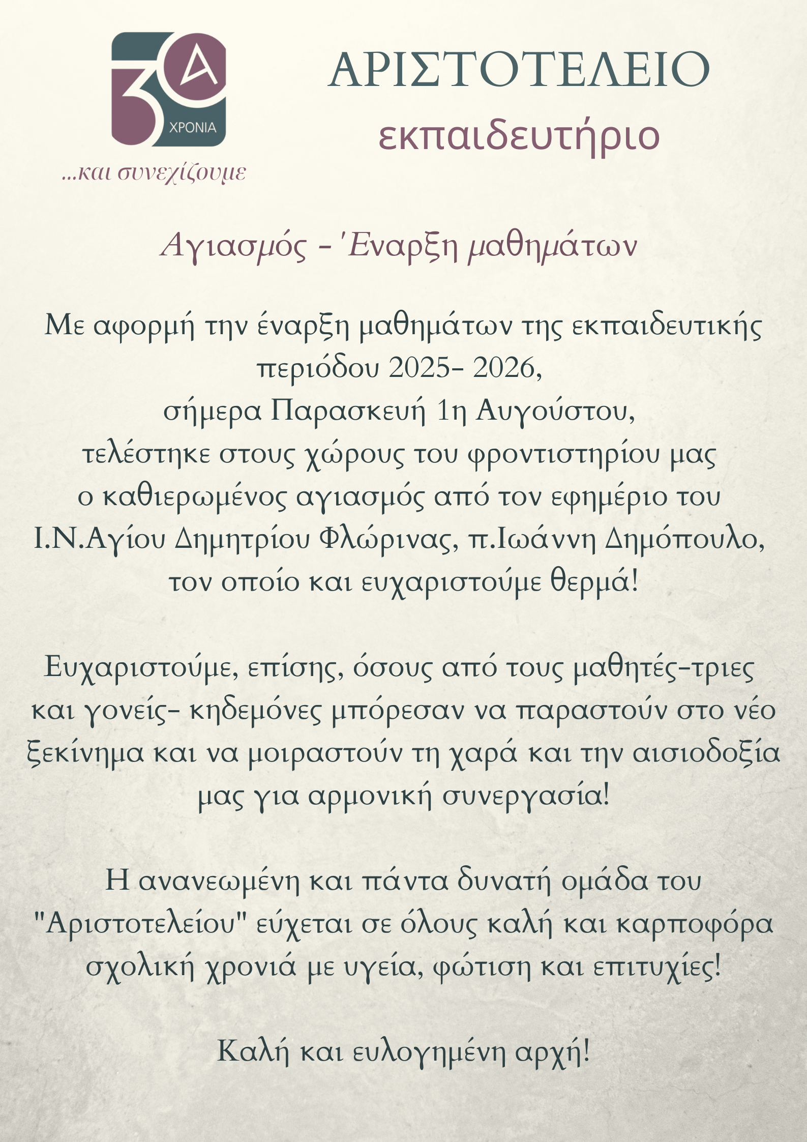 ΚοινωνίαΑγιασμός-Έναρξη μαθημάτων στο Εκπαιδευτήριο “Αριστοτέλειο” Παρασκευή 1 Αυγούστου, 2025 21:39 florinapress.gr SHARE Ίσως να ενδιαφέρει ... Ευχαριστήριο του 3ου Γυμνασίου Φλώρινας Ο Αγιασμός στα σχολεία των Πρεσπών Ευχαριστήριο του 3ου Γυμνασίου Φλώρινας προς τον Σύλλογο Γονέων και Κηδεμόνων Συγχαρητήριο στον Πρόεδρο της Ένωσης Αστυνομικών Υπαλλήλων Φλώρινας κ. Γιάννη Μουρατίδη Ευχαριστήριο του 1ου ΓΕΛ Φλώρινας Share Ακολουθήστε μας8.4kFollowersLikeΤελευταία νέα Αγανακτισμένοι αγρότες : Ως εδώ, η κατάσταση δεν πάει άλλο Κοινωνία Πέμπτη 4 Δεκεμβρίου, 2025 Επισκέψεις Κινητών Μονάδων Υγείας σε απομακρυσμένες Κοινότητες του Δήμου Αμυνταίου Κοινωνία Πέμπτη 4 Δεκεμβρίου, 2025 Ευχαριστήρια επιστολή του Πειραματικού Σχολείου Φλώρινας προς το Κέντρο Περιβαλλοντικής Εκπαίδευσης & Αειφορίας Μελίτης Κοινωνία Πέμπτη 4 Δεκεμβρίου, 2025 Πωλείται Γερμανικός λέβητας ξύλου Κοινωνία Πέμπτη 4 Δεκεμβρίου, 2025