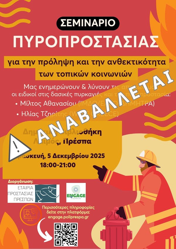 Λόγω απρόβλεπτου προβλήματος υγείας, είμαστε στη δυσάρεστη θέση να ανακοινώσουμε την αναβολή του σεμιναρίου για Δασικές Πυρκαγιές στην Πρέσπα «Δασικές Πυρκαγιές: Πρόληψη & Ανθεκτικότητα των Τοπικών Κοινωνιών» την Παρασκευή 05/12/2025.