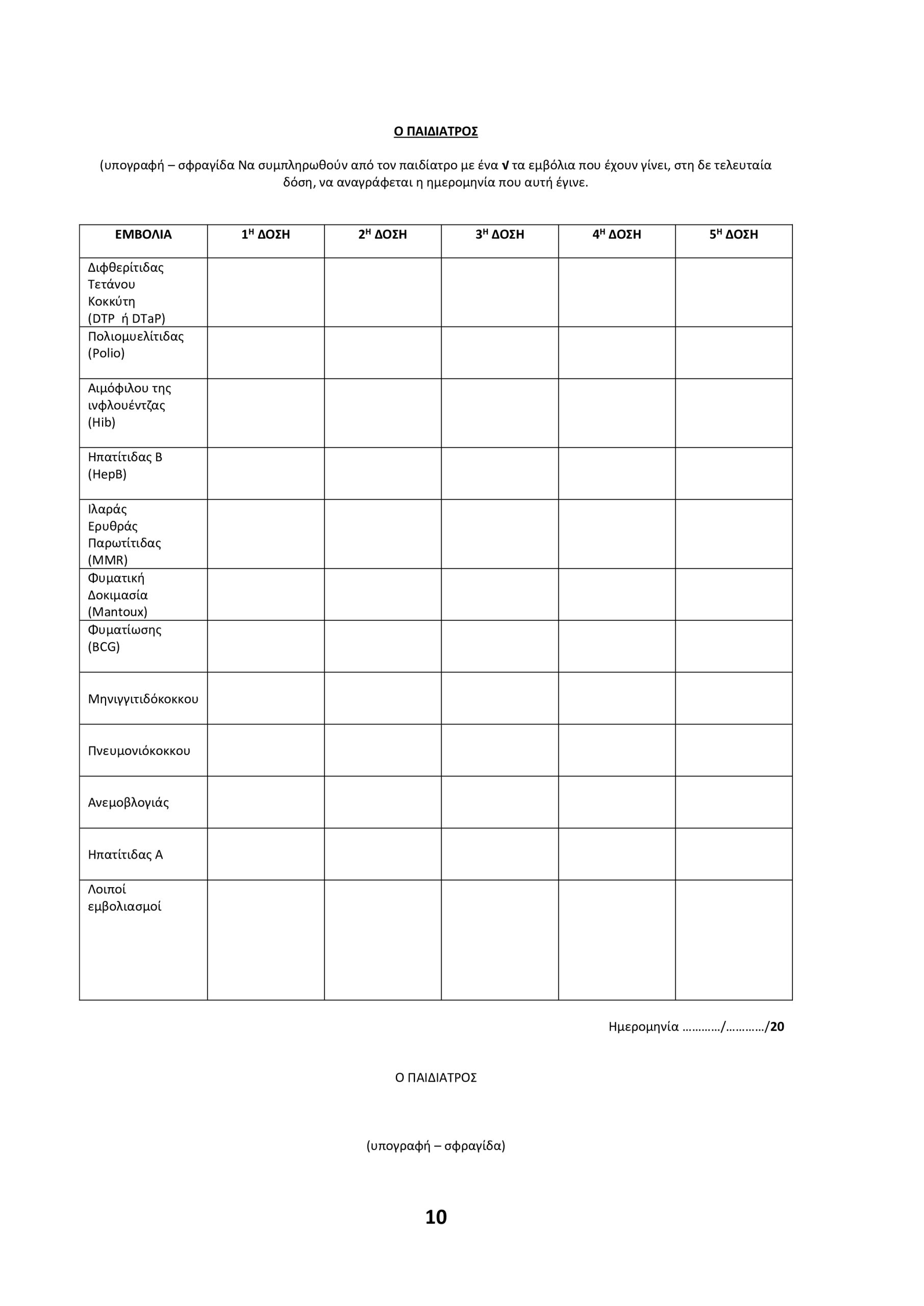 - Ατομικό Δελτίο Υγείας, συμπληρωμένο από παιδίατρο με πλήρη στοιχεία εμβολιασμών, ημερομηνίες και το αποτέλεσμα της φυματοαντίδρασης (mantoux), όπως κάθε φορά προβλέπεται από το Εθνικό Πρόγραμμα Εμβολιασμών.