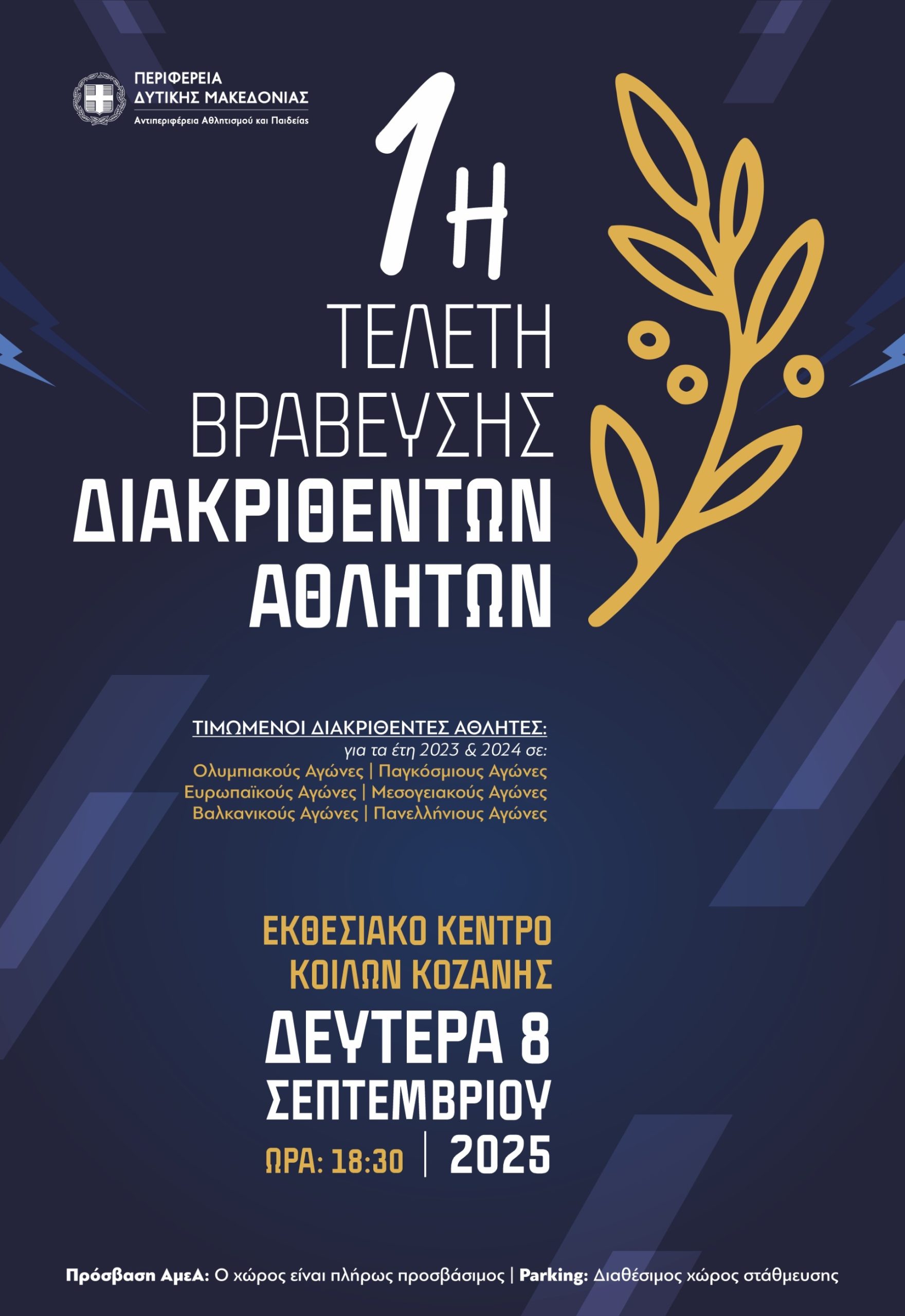 Η Περιφέρεια Δυτικής Μακεδονίας διοργάνωσε την Δευτέρα 8/9/2025 λαμπρή τελετή βράβευσης των διακριθέντων αθλητών της, σε μια εκδήλωση που τιμά την προσπάθεια, την επιμονή και τις σημαντικές επιτυχίες τους σε εθνικό και διεθνές επίπεδο. Στην εκδήλωση, που πραγματοποιήθηκε στο εκθεσιακό κέντρο στα Κοίλα Κοζάνης, απονεμήθηκαν τιμητικές διακρίσεις σε αθλητές της Περιφέρειας που ξεχώρισαν τις χρονιές 2023 & 2024.