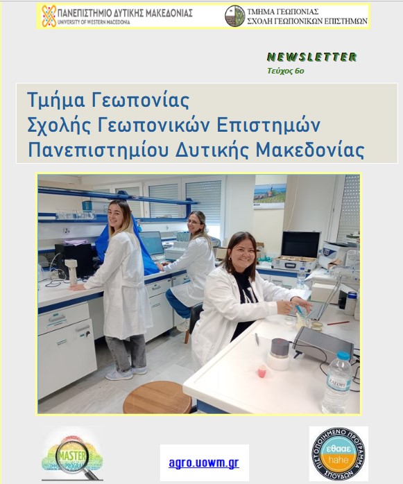 Εκδόθηκε και το 6ο τεύχος του Newsletter του τμήματος Γεωπονίας της Σχολής Γεωπονικών Επιστημών του Πανεπιστημίου Δυτικής Μακεδονίας. Οι αναγνώστες έχουν την ευκαιρία να ενημερωθούν για την πλούσια δράση του τμήματος στην έρευνα και στην εκπαίδευση, για τη συμμετοχή των μελών του Διδακτικού και Ερευνητικού Προσωπικού σε εγχώρια και διεθνή συνέδρια, τις δημοσιεύσεις εργασιών σε επιστημονικά περιοδικά, τις συνεργασίες με φορείς και Πανεπιστήμια του Εσωτερικού και του Εξωτερικού καθώς και άλλες κοινωνικές δράσεις.