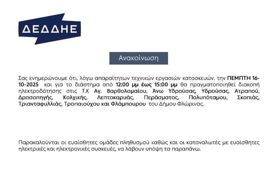 Διακοπή ηλεκτροδότησης στις Τ.Κ Αγ. Βαρθολομαίου, Άνω Υδρούσας, Υδρούσας, Ατραπού, Δροσοπηγής, Κολχικής, Λεπτοκαρυάς, Περάσματος, Πολυπόταμου, Σκοπιάς, Τριανταφυλλιάς, Τροπαιούχου και Φλάμπουρου του Δήμου Φλώρινας
