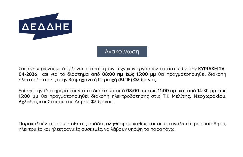Σας ενημερώνουμε ότι, λόγω απαραίτητων τεχνικών εργασιών κατασκευών, την ΚΥΡΙΑΚΗ 26-04-2026 και για το διάστημα από 08:00 πμ έως 15:00 μμ θα πραγματοποιηθεί διακοπή ηλεκτροδότησης στην Βιομηχανική Περιοχή (ΒΙΠΕ) Φλώρινας.