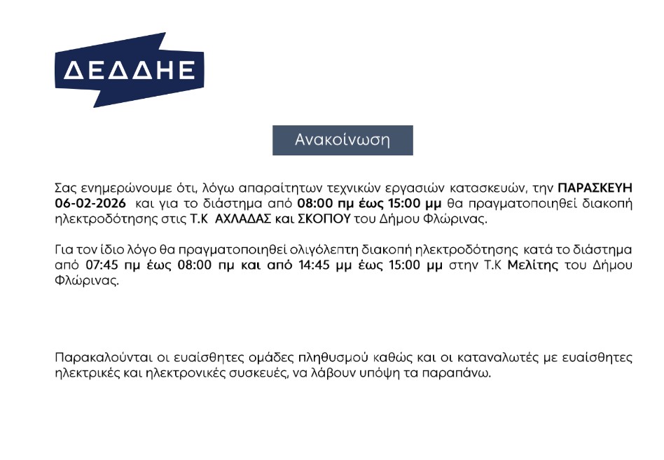 ΚοινωνίαΔιακοπή ηλεκτροδότησης στις Τ.Κ Αχλάδας και Σκοπού του Δήμου Φλώρινας Πέμπτη 5 Φεβρουαρίου, 2026 14:35 florinapress.gr SHARE Ίσως να ενδιαφέρει ... Εσύ γνώριζες ότι υπάρχει παιδικό τμήμα γυμναστικής και ευ ζην από την Ολυμπιονίκη Χρήστου Ιωάννα; Λίγες θέσεις απομένουν, κάνε την εγγραφή τώρα! Συνάντηση του Αγροτικού Συνεταιρισμού και του Πρόεδρου της Κοινότητας Αγίου Παντελεήμονα με τον Δήμαρχο Αμυνταίου Ιωάννη Λιάση Δράσεις ενημέρωσης αγροτών και Πιστοποίηση Αγροτικών Προϊόντων της περιοχής από τον Σύλλογο Γεωπόνων Φλώρινας Τι είναι η Γνωσιακή Συμπεριφορική Θεραπεία (ΓΣΘ) Ορισμοί διαιτητών για τους αγώνες ποδοσφαίρου ΕΠΣ Φλώρινας 27 & 28/1/2018 Share Ακολουθήστε μας8.4kFollowersLikeΤελευταία νέα Ανέλαβε και εκτελεί καθήκοντα Αστυνομικού Διευθυντή της Διεύθυνσης Αστυνομίας Φλώρινας ο Αστυνομικός Διευθυντής Ευστάθιος Λαγός Κοινωνία Πέμπτη 5 Φεβρουαρίου, 2026 Ομαδικοί μαθητικοί αγώνες Σκάκι Αθλητισμός Πέμπτη 5 Φεβρουαρίου, 2026 Ευχαριστήριο του Πειραματικού Δημοτικού Σχολείου Φλώρινας Κοινωνία Πέμπτη 5 Φεβρουαρίου, 2026 Κοπή βασιλόπιτας του Σωματίου ΔΕΗ νομού Φλώρινας Πολιτισμός Πέμπτη 5 Φεβρουαρίου, 2026