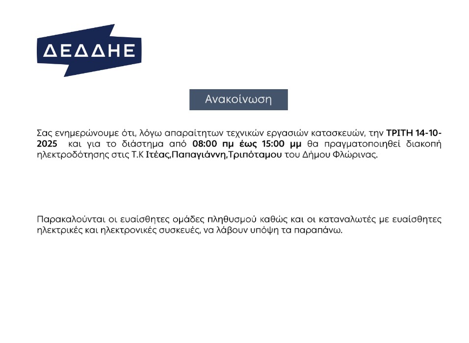 ΚοινωνίαΔιακοπή ηλεκτροδότησης στις Τ.Κ. Ιτέας, Παπαγιάννη, Τριποτάμου του Δήμου Φλώρινας Δευτέρα 13 Οκτωβρίου, 2025 13:02 florinapress.gr SHARE Ίσως να ενδιαφέρει ... Συνελήφθη 65χρονος ημεδαπός, σε περιοχή της Φλώρινας, διότι μετέφερε παράνομα στο εσωτερικό της χώρας 43χρονη αλλοδαπή Ο Πολιτιστικός Σύλλογος «ΟΚΤΑΒΑ» στηρίζει τη δράση «Φαγητό για όλους» Ο Δήμαρχος Φλώρινας ομιλητής στην παρουσίαση του νέου βιβλίου του δικηγόρου κ. Στέλιου Μαυρίδη Εκδηλώσεις της παγκόσμιας συνομοσπονδίας Παμμακεδονικών Ενώσεων Διημερίδα με θέμα: “Αλισάχνες Share Ακολουθήστε μας8.4kFollowersLikeΤελευταία νέα Αγανακτισμένοι αγρότες : Ως εδώ, η κατάσταση δεν πάει άλλο Κοινωνία Πέμπτη 4 Δεκεμβρίου, 2025 Επισκέψεις Κινητών Μονάδων Υγείας σε απομακρυσμένες Κοινότητες του Δήμου Αμυνταίου Κοινωνία Πέμπτη 4 Δεκεμβρίου, 2025 Ευχαριστήρια επιστολή του Πειραματικού Σχολείου Φλώρινας προς το Κέντρο Περιβαλλοντικής Εκπαίδευσης & Αειφορίας Μελίτης Κοινωνία Πέμπτη 4 Δεκεμβρίου, 2025 Πωλείται Γερμανικός λέβητας ξύλου Κοινωνία Πέμπτη 4 Δεκεμβρίου, 2025