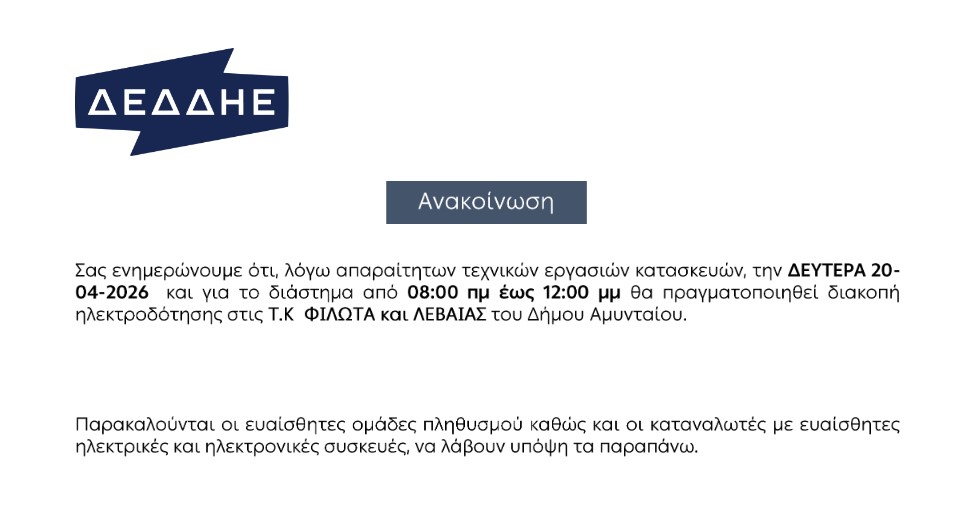 Σας ενημερώνουμε ότι, λόγω απαραίτητων τεχνικών εργασιών κατασκευών, την ΔΕΥΤΕΡΑ 20-04-2026 και για το διάστημα από 08:00 πμ έως 12:00 μμ θα πραγματοποιηθεί διακοπή ηλεκτροδότησης στις Τ.Κ ΦΙΛΩΤΑ και ΛΕΒΑΙΑΣ του Δήμου Αμυνταίου