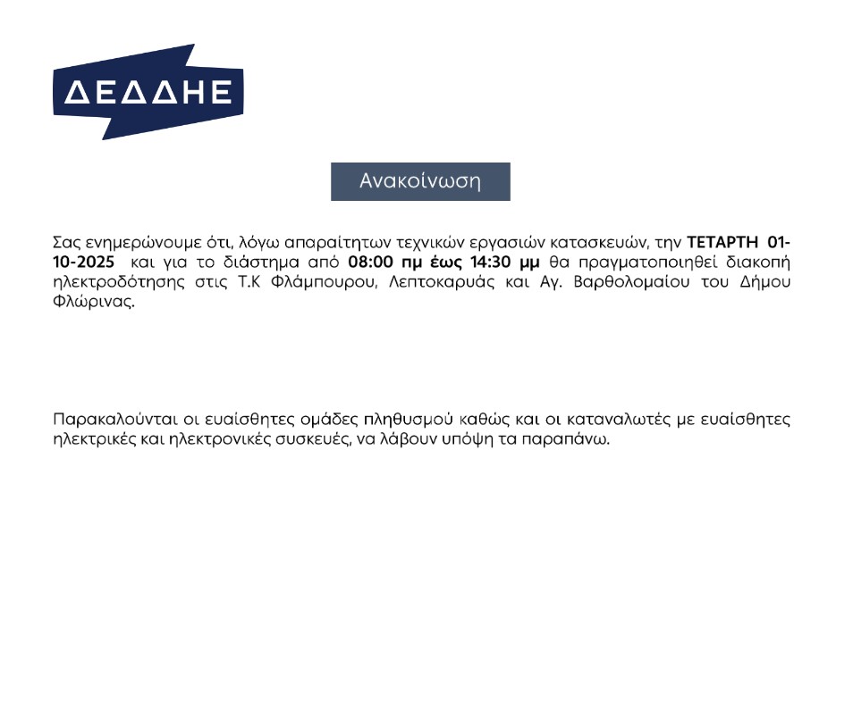 Σας ενημερώνουμε ότι, λόγω απαραίτητων τεχνικών εργασιών κατασκευών, την ΤΕΤΑΡΤΗ 01-10-2025 και για το διάστημα από 08:00 πμ έως 14:30 μμ θα πραγματοποιηθεί διακοπή ηλεκτροδότησης στις Τ.Κ Φλάμπουρου, Λεπτοκαρυάς και Αγ. Βαρθολομαίου του Δήμου Φλώρινας.