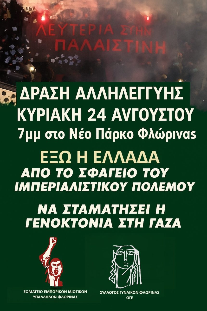 Το Σωματείο Εμπορικών / Ιδιωτικών υπαλλήλων Φλώρινας και ο Σύλλογος Γυναικών Φλώρινας, μέλος ΟΓΕ, μαζί με εκατοντάδες Συνδικάτα, Ομοσπονδίες, Εργατικά Κέντρα, Συλλόγους Γυναικών σε όλη τη χώρα, συνεχίζουμε τον αγώνα για να σταματήσει η γενοκτονία του λαού της Παλαιστίνης. Είμαστε στο πλευρό όλων όσων σήμερα παρά τις συλλήψεις, τις διώξεις και την άγρια καταστολή, αντιστέκονται μέσα στη καρδιά του κτήνους μέσα στο δολοφονικό κράτος του Ισραήλ, ενάντια στη γενοκτονία του Παλαιστινιακού λαού.