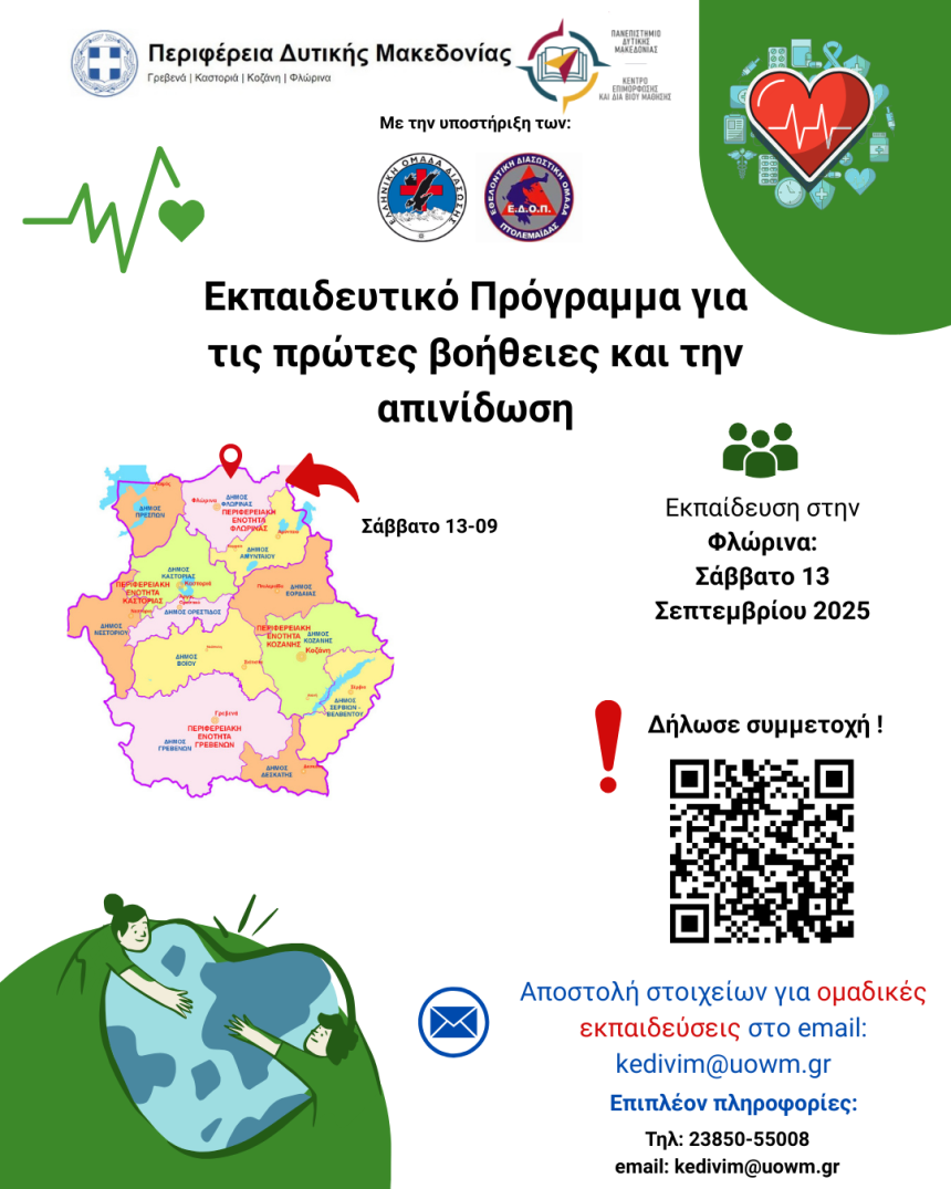 Το Κέντρο Επιμόρφωσης και Δια Βίου Μάθησης (ΚΕΔΙΒΙΜ), σε συνεργασία με την Περιφέρεια Δυτικής Μακεδονίας, διοργανώνει δωρεάν Εκπαιδευτικό Πρόγραμμα Πρώτων Βοηθειών και Απινίδωσης. Το πρόγραμμα απευθύνεται σε όλους τους πολίτες της Περιφέρειας, με σκοπό τη διαμόρφωση μιας κοινωνίας προετοιμασμένης να ανταποκριθεί αποτελεσματικά σε κρίσιμα περιστατικά.