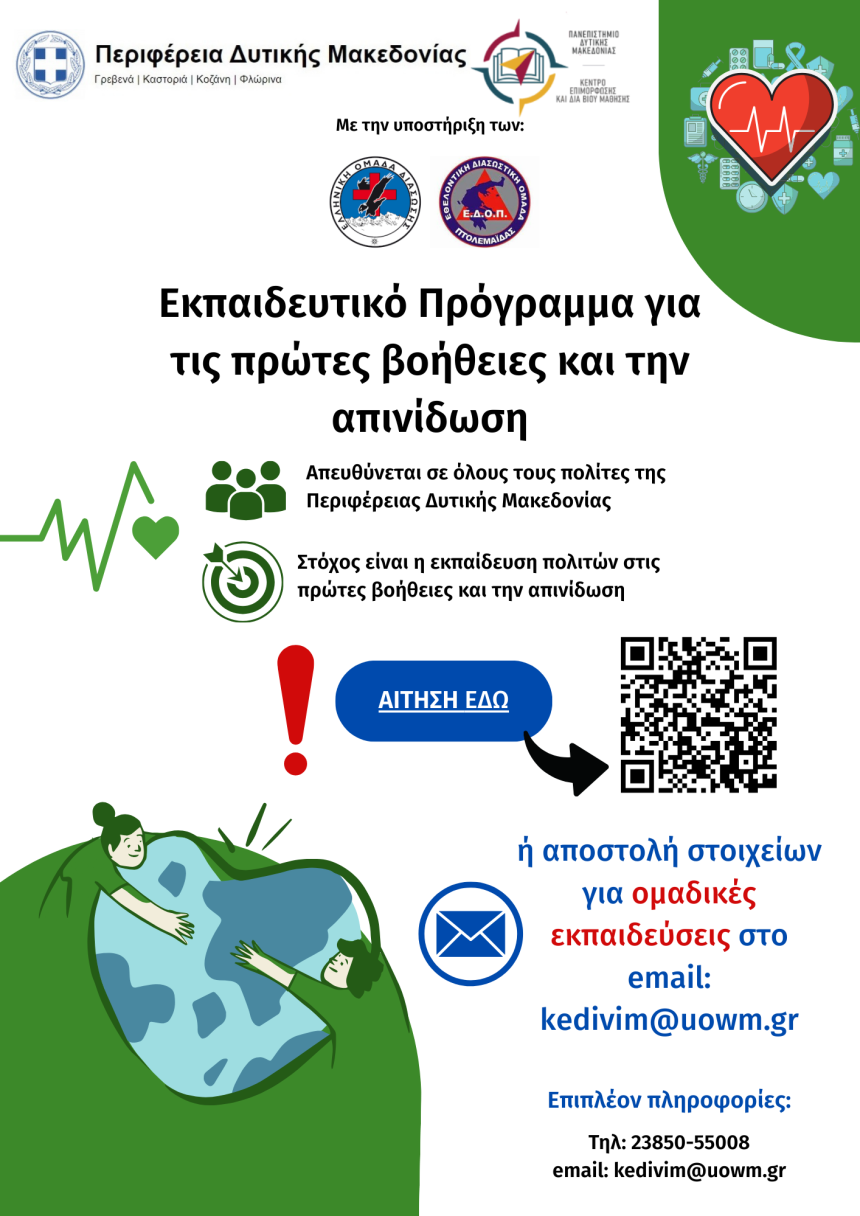 Το Κέντρο Επιμόρφωσης και Δια Βίου Μάθησης (ΚΕΔΙΒΙΜ), σε συνεργασία με την Περιφέρεια Δυτικής Μακεδονίας, διοργανώνει δωρεάν Εκπαιδευτικό Πρόγραμμα Πρώτων Βοηθειών και Απινίδωσης. Το πρόγραμμα απευθύνεται σε όλους τους πολίτες της Περιφέρειας, με σκοπό τη διαμόρφωση μιας κοινωνίας προετοιμασμένης να ανταποκριθεί αποτελεσματικά σε κρίσιμα περιστατικά.