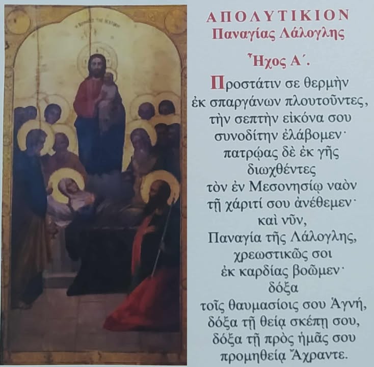 Ολοκληρώθηκαν οι τετραήμερες λατρευτικές και πολιτιστικές εκδηλώσεις για τον εορτασμό της Κοιμήσεως της Θεοτόκου και τη Σύναξη της Παναγίας Λάλογλη στο Μεσονήσι Φλώρινας. Στις 14 Αυγούστου, παρουσία πλήθους πιστών, τελέστηκε πανηγυρικός εσπερινός και ακολούθησε λιτανεία της Ιεράς Εικόνας. Στις 15 Αυγούστου, εορτή της Κοιμήσεως της Θεοτόκου, τελέστηκε Θεία Λειτουργία μετά θείου κηρύγματος και το βράδυ της ίδιας ημέρας πραγματοποιήθηκε μεγάλο παραδοσιακό γλέντι. Στις 16 Αυγούστου τελέστηκε πανηγυρικός εσπερινός και στις 17 Αυγούστου το πρωί εορτάστηκε πανηγυρικά η Σύναξη της Παναγίας Λάλογλη, με Αρχιερατική Θεία Λειτουργία, παρουσία των τοπικών αρχών, καθως και πλήθος κόσμου από την ευρύτερη περιοχή. Ο Μητροπολίτης Φλωρίνης, Πρεσπών και Εορδαίας κ.κ. Ειρηναίος στο κύρηγμά του υπογράμμισε ότι η Παναγία Λάλογλη δεν είναι απλώς ένα ιστορικό κειμήλιο, αλλά ζωντανός πνευματικός θησαυρός, που μεταφέρει το βίωμα και την πίστη των προσφύγων και παραμένει σημείο ελπίδας και προστασίας για τους πιστούς. Κατά τον Όρθρο, ο χορός έψαλε το απολυτίκιο, καθώς και ύμνους για την Παναγία Λάλογλη, που συνέγραψε ο Φιλόλογος και Ιεροψαλτης κ. Παπαδόπουλος Δημήτριος. Ακολούθησαν παραδοσιακές ποντιακές εκδηλώσεις στο προαύλιο του Ιερού Ναού, που περιλάμβαναν ομιλία για την Ιστορία της Ιεράς Εικόνας, τραγούδι και χορό, ενώ προσφέρθηκαν σε όλους ποντιακά και άλλα εδέσματα, που ετοίμασαν οι κυρίες του χωριού.