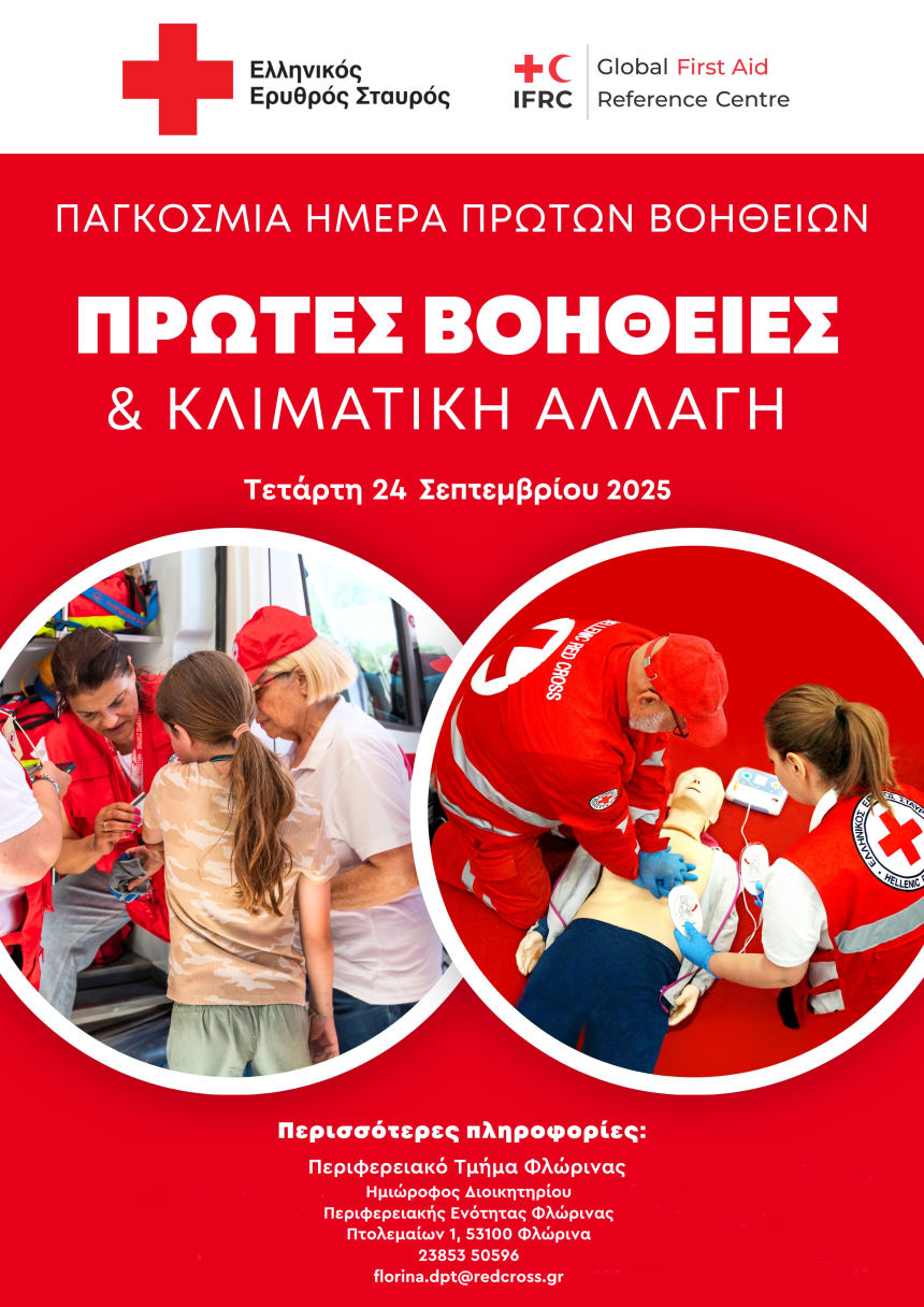 Στο πλαίσιο της Παγκόσμιας Ημέρας Πρώτων Βοηθειών θα πραγματοποιηθεί ανοιχτή δράση με δημόσια επίδειξη Πρώτων Βοηθειών από την Νοσηλεύτρια-Εκπαιδεύτρια και τις Εθελόντριες Υγείας του Περιφερειακού Τμήματος Φλώρινας του Ελληνικού Ερυθρού Σταυρού, προς το ευρύ κοινό της πόλης μας το πρωινό της Τετάρτης 24/9/25 στον ισόγειο χώρο της εισόδου του Κτηρίου της Περιφερειακής Ενότητας Φλώρινας.