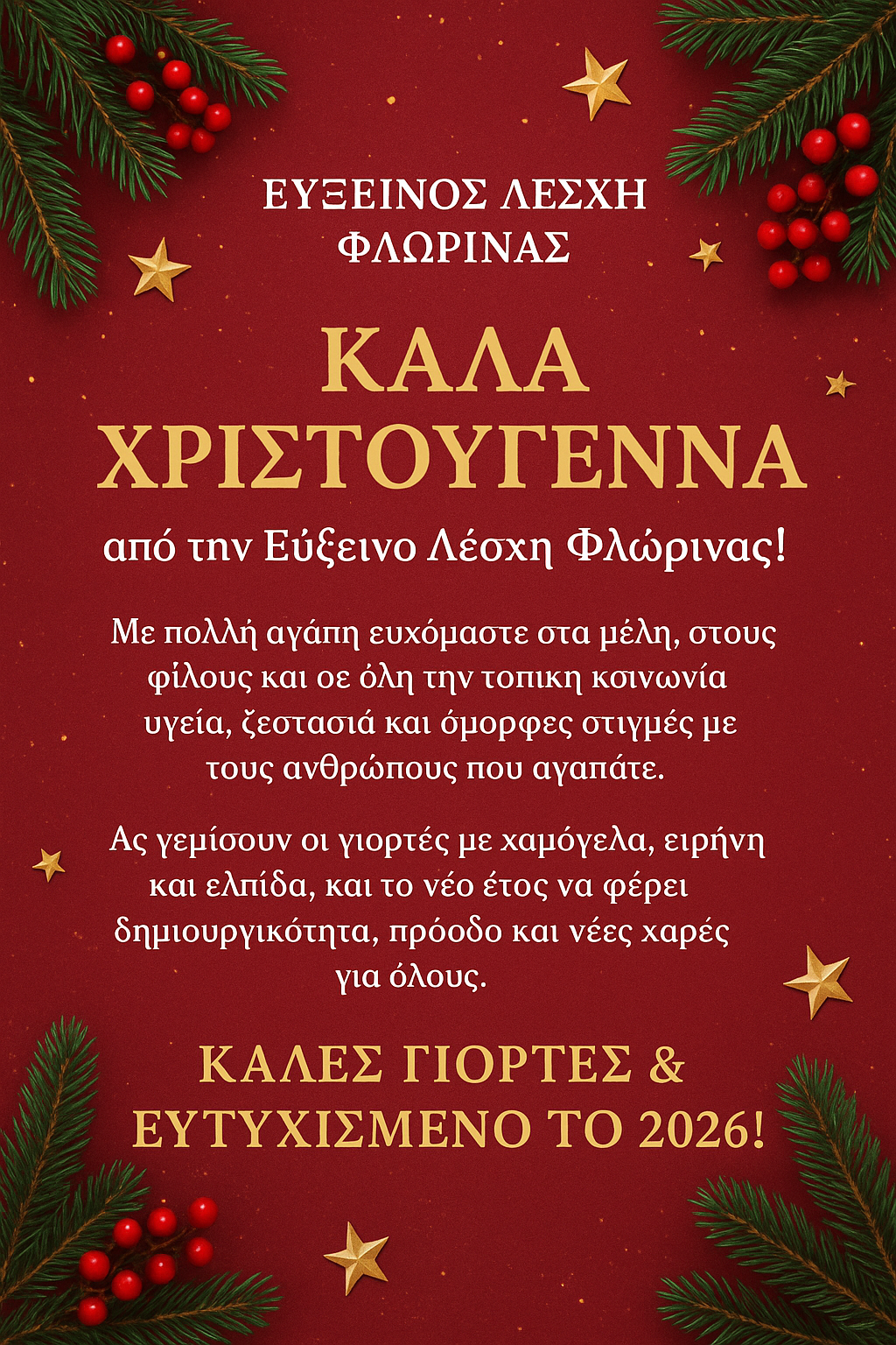 ΚοινωνίαΠολιτισμόςΕυχές από την Εύξεινο Λέσχη Φλώρινας Παρασκευή 19 Δεκεμβρίου, 2025 19:33 florinapress.gr SHARE Ίσως να ενδιαφέρει ... Διημερίδα με θέμα «Φλώρινα ο Βόρειος προμαχώνας του Ελληνισμού» Ανακοίνωση του Δήμου Αμυνταίου σχετικά με την παραχώρηση αίθουσας Κοινοτικού Καταστήματος της Τ.Κ. Ξινού Νερού 22 Μαρτίου – Παγκόσμια Ημέρα Νερού Πραγματοποιήθηκε ο ετήσιος χορός του Α.Σ. Άρης Λόφων Διεξαγωγή δωρεάν εκπαιδευτικού σεμιναρίου & συνεντεύξεις υποψηφίων για εργασία στον τομέα του Τουρισμού στη Φλώρινα Share Ακολουθήστε μας8.4kFollowersLikeΤελευταία νέα Μνημόσυνα Σαββάτου 10 και Κυριακής 11 Ιανουαρίου Κοινωνικά Παρασκευή 9 Ιανουαρίου, 2026 Η ζεστασιά που… μοιράζεται! – Δώρα για όλους όσους θέλουν να χαρίσουν δώρα Κοινωνία Παρασκευή 9 Ιανουαρίου, 2026 Κηδεία της Αυγούλας Τάσκα, ετών 73 Κοινωνικά Παρασκευή 9 Ιανουαρίου, 2026 Υπογραφή σύμβασης για την προμήθεια μικρού ελαστικοφόρου φορτωτή στον Δήμο Πρεσπών Πολιτική Παρασκευή 9 Ιανουαρίου, 2026