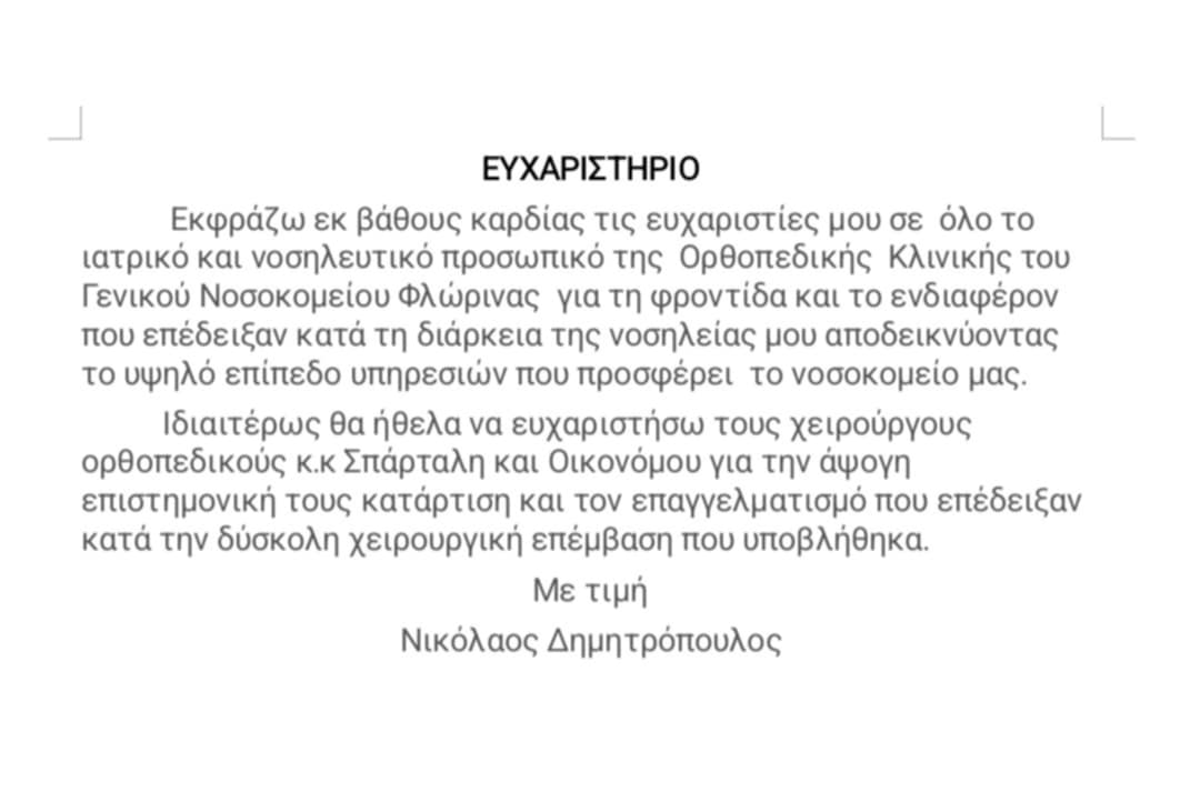 ΚοινωνίαΕυχαριστήριο μήνυμα προς το Νοσοκομείο Φλώρινας Πέμπτη 22 Ιανουαρίου, 2026 22:19 florinapress.gr SHARE Ίσως να ενδιαφέρει ... Έκπτωση 50% σε όλα τα εισιτήρια του ΚΤΕΛ Υπεραστικών Γραμμών Ν. Φλώρινας στις 28 Φεβρουαρίου Ορκωμοσία υπαλλήλων του “Βοήθεια στο Σπίτι” στο Δήμο Αμυνταίου Ο Δήμος Φλώρινας καταδικάζει τη ρίψη φόλας σε αδέσποτα Μεταφορά ημέρας διενέργειας λαϊκών αγορών ημέρας Δευτέρας του Δήμου Αμυνταίου λόγω αργίας Στο μηδέν η απόφαση του Αμυνταίου Share Ακολουθήστε μας8.4kFollowersLikeΤελευταία νέα Ετήσιος χορός του Πολιτιστικού Συλλόγου Σιταριάς “Νέοι Ορίζοντες” Εκδηλώσεις Πολιτισμός Πέμπτη 22 Ιανουαρίου, 2026 Ευχαριστήριο στο Νοσοκομείο Φλώρινας Κοινωνία Πέμπτη 22 Ιανουαρίου, 2026 Ζητείται εργασία Κοινωνία Πέμπτη 22 Ιανουαρίου, 2026 Πωλούνται έπιπλα και οικιακά είδη Κοινωνία Πέμπτη 22 Ιανουαρίου, 2026