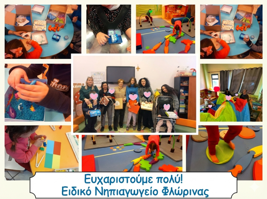 Το Ειδικό Νηπιαγωγείο Φλώρινας εκφράζει τις θερμές και ειλικρινείς του ευχαριστίες προς την εταιρεία ΑΙΓΕΑΣ ΑΜΚΕ των κ.κ. Αθανασίου και Μαρίνας Μαρτίνου για την ευγενική και πολύτιμη δωρεά υλικών Εργοθεραπείας και Φυσιοθεραπείας.