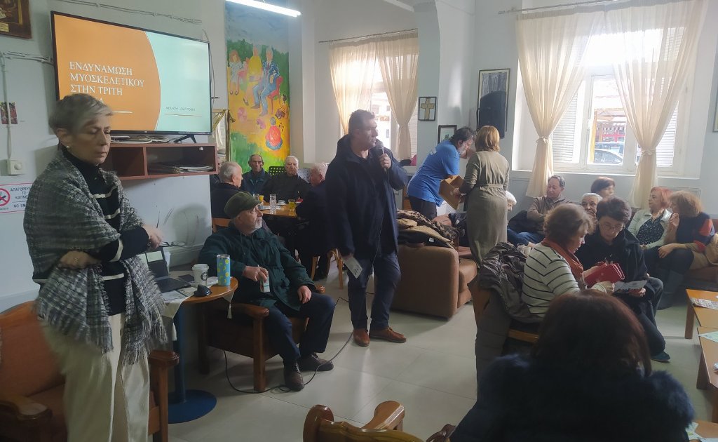 Παράλληλα, ο γυμναστής κ. Ευάγγελος Ευαγγέλου ανέπτυξε πρακτικές ασκήσεις ενδυνάμωσης και ισορροπίας, προσαρμοσμένες στις ανάγκες της τρίτης ηλικίας, δίνοντας έμφαση στη σωστή στάση του σώματος και στην πρόληψη των πτώσεων.
