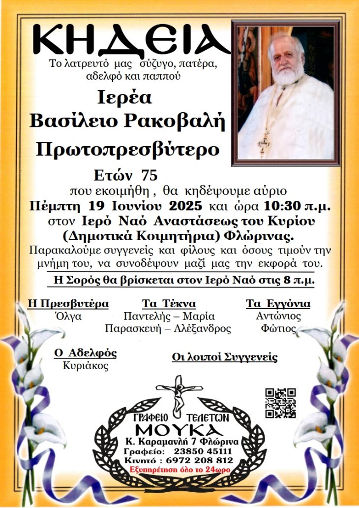 Η Ιερά Μητρόπολη Φλωρίνης, Πρεσπών και Εορδαίας, μετά συγκινήσεως, αναγγέλλει την προς Κύριον εκδημία του μακαριστού Πρωτοπρεσβυτέρου Βασιλείου Ρακοβαλή.