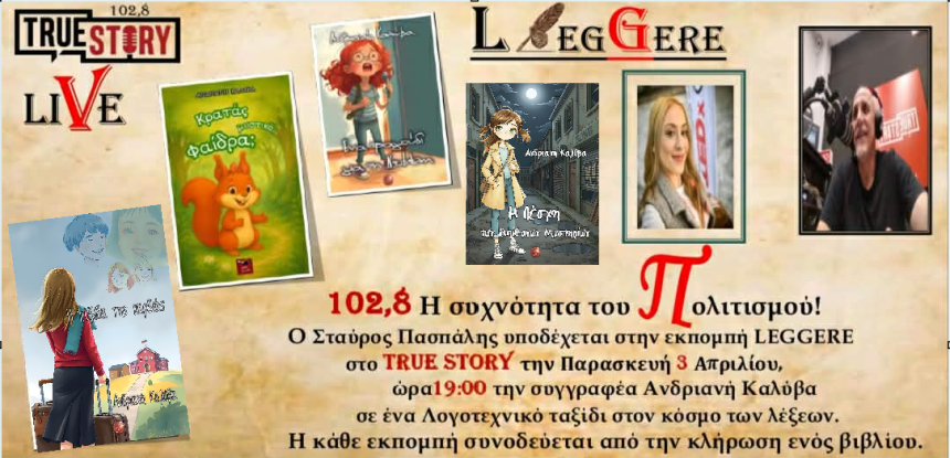 Στο πλαίσιο του εορτασμού της Παγκόσμιας Ημέρας Παιδικής Λογοτεχνίας, η εκπομπή λόγου και τέχνης “Leggere” υποδέχεται τη διακεκριμένη συγγραφέα Ανδριανή Καλύβα. Ο παρουσιαστής Σταύρος Πασπάλης θα συνομιλήσει μαζί της την Παρασκευή 3 Απριλίου 2026, από τις 7 έως τις 9 το βράδυ, στη συχνότητα 102.8 FM της Πτολεμαΐδας, με θέμα τη λογοτεχνία για παιδιά και νέους.